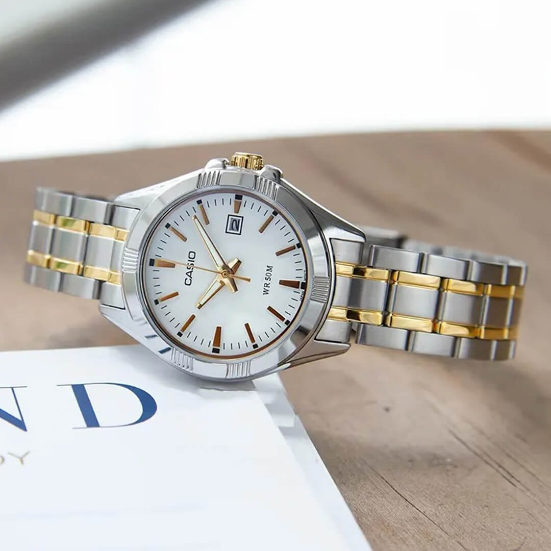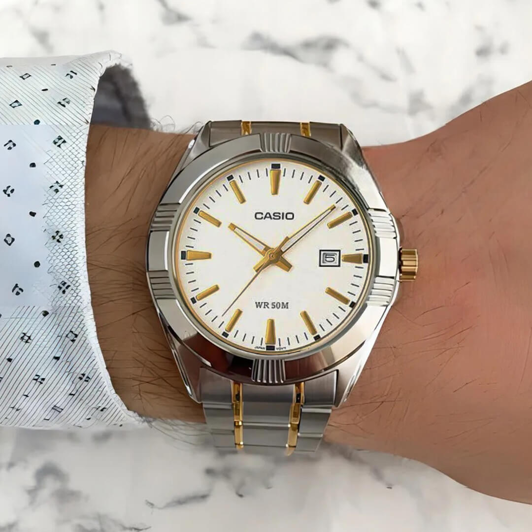 El Casio MTP-V006D-1B2 representa la evolución del reloj clásico de vestir con un enfoque más refinado y elegante. Su acabado bicolor en plata y oro, combinado con una esfera blanca limpia y bien proporcionada, proyecta una imagen sofisticada que encaja perfectamente tanto en contextos formales como en el uso diario profesional.
