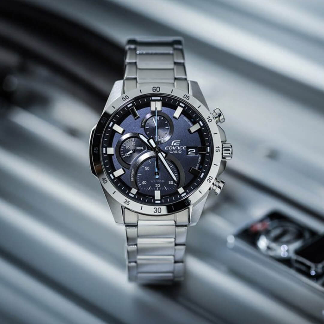Reloj Edifice EFR-571D-1A (EDF-20), un reloj metálico de alto rendimiento. El dial interior y los indicadores definidos, tridimensionales y extragruesos tienen un acabado con un diseño deportivo y dinámico. Un dial retrógrado en la posición de las 9 del dial interior avanza en forma de abanico con la manecilla de minutos del cronómetro y vuelve a 0 cada 10 minutos.