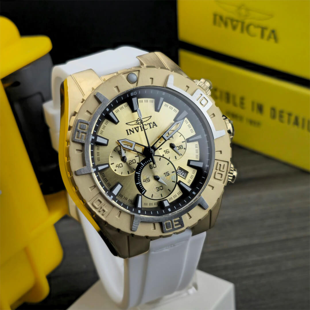 El Invicta Aviator 37636 (INV-430) es un reloj que lleva la esencia de la aviación al terreno del lujo contemporáneo. Diseñado para hombres que buscan precisión y estilo, este modelo combina una caja dorada de acero inoxidable de 49 mm con un llamativo tablero dorado metálico y una correa de silicona blanca que aporta frescura, modernidad y comodidad.