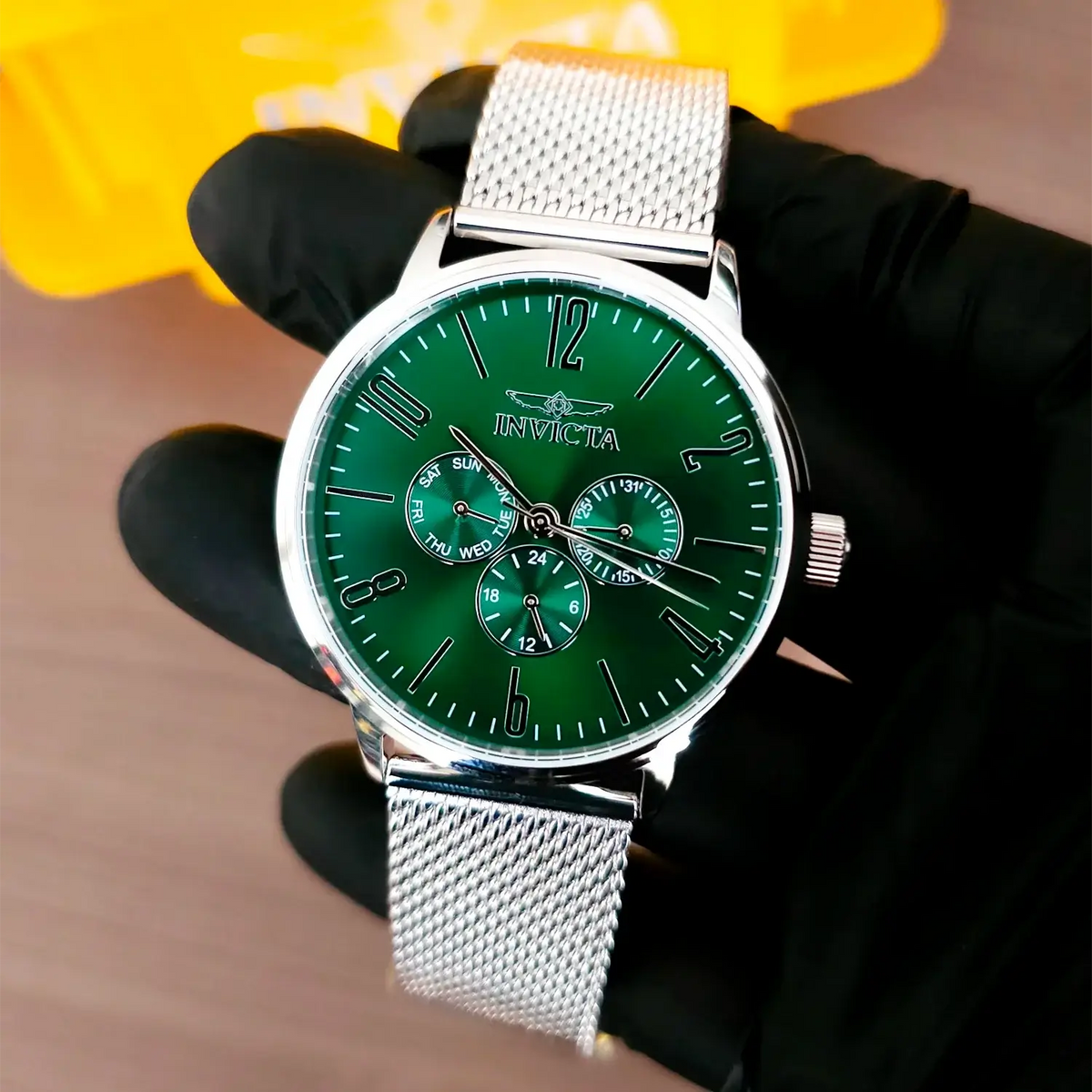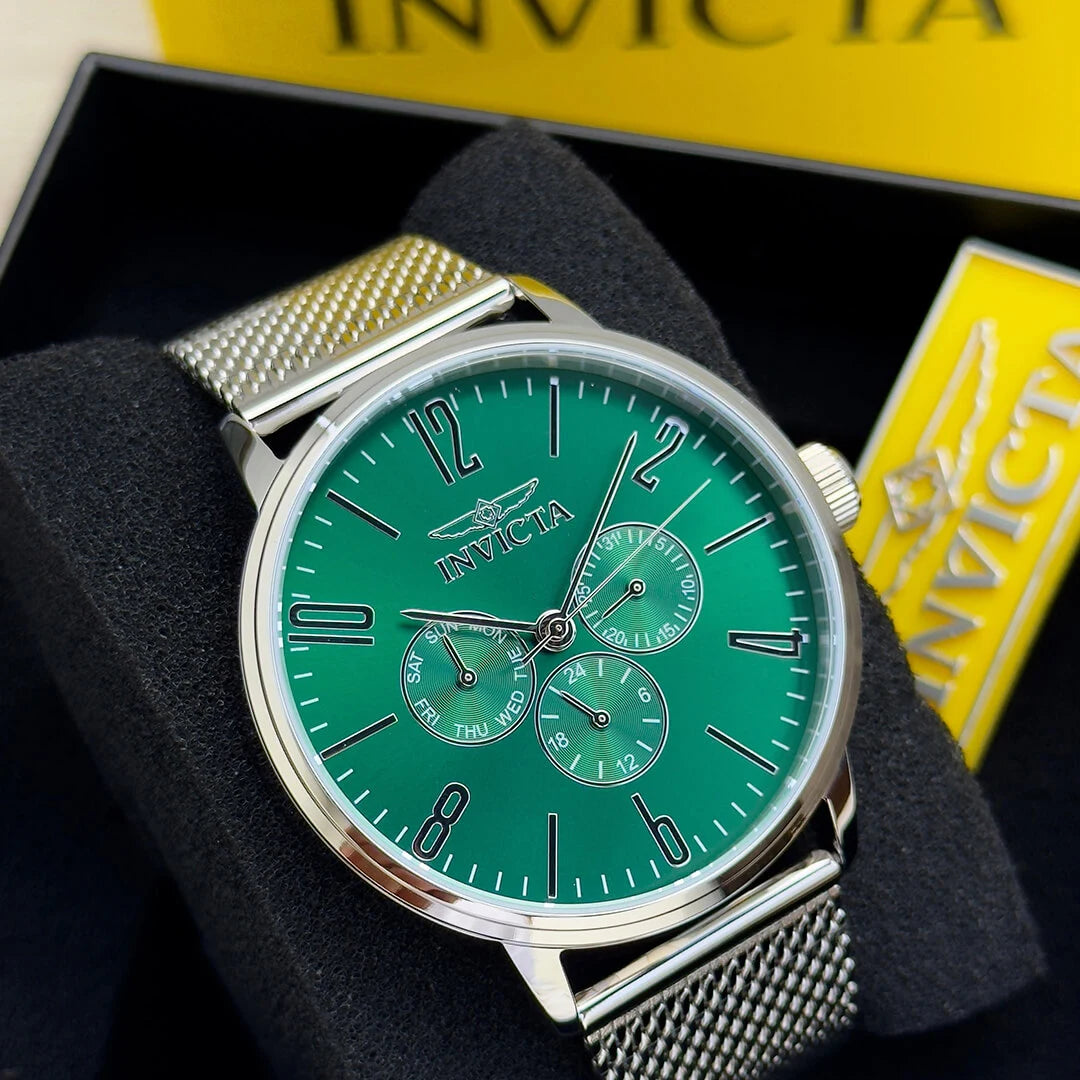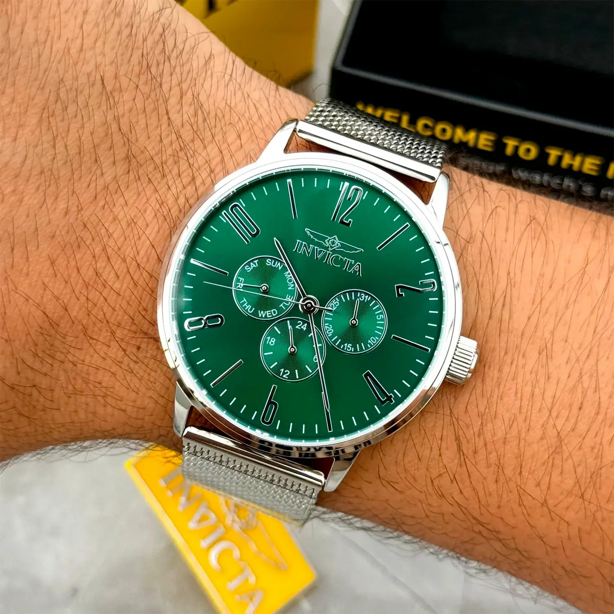 El Invicta Specialty 47120 (INV-326) es un reloj que transmite simplicidad elegante, sin adornos innecesarios. Su diseño se basa en una estructura de acero inoxidable plateado, con una caja de 44 mm que marca presencia, una esfera en verde intenso que captura la atención con discreción, y un acabado general pulido que resalta sin exagerar.
