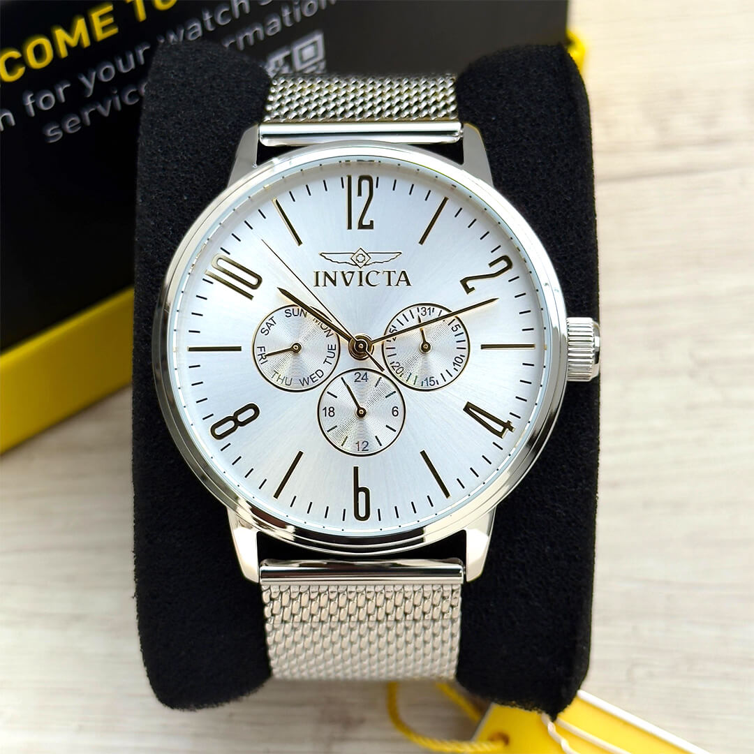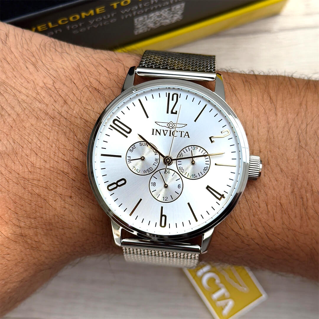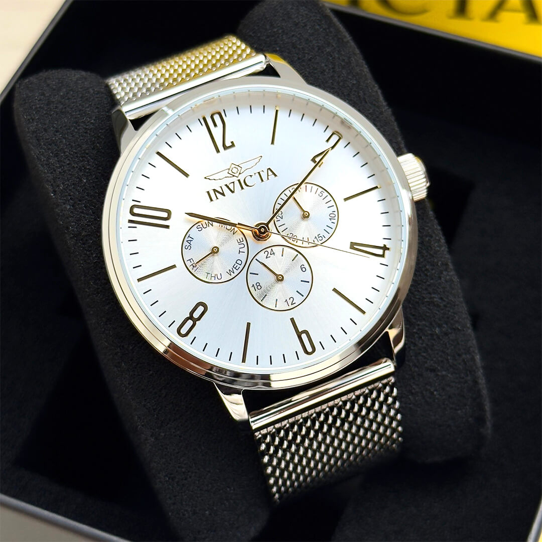El Invicta Specialty 47614 (INV-325) destaca como ese reloj que no solo da la hora, sino que comunica identidad. Diseñado para quienes valoran diseño refinado, presencia y practicidad con elegancia, este modelo fusiona construcción de acero inoxidable, acabado plateado solar en el dial y detalles dorados que dan carácter sin exceso.