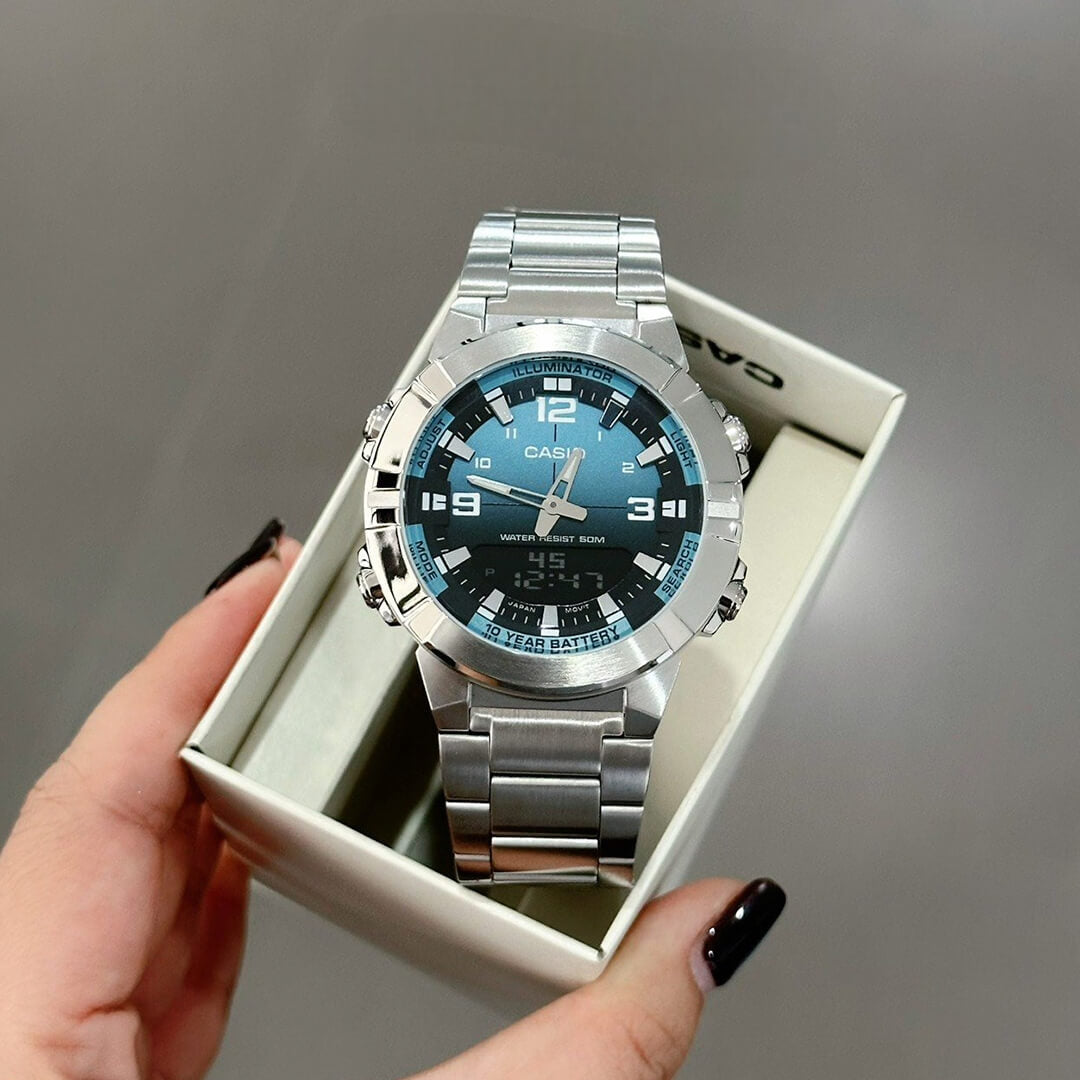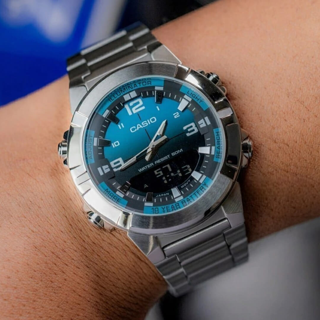 El Casio AMW-870DA-2A2VDF (CAS-156) es un reloj analógico-digital diseñado para quienes exigen máxima funcionalidad, resistencia y un estilo deportivo refinado. Combina una robusta caja y correa de acero inoxidable resistente, logrando un equilibrio perfecto entre presencia, durabilidad y uso diario intensivo.
