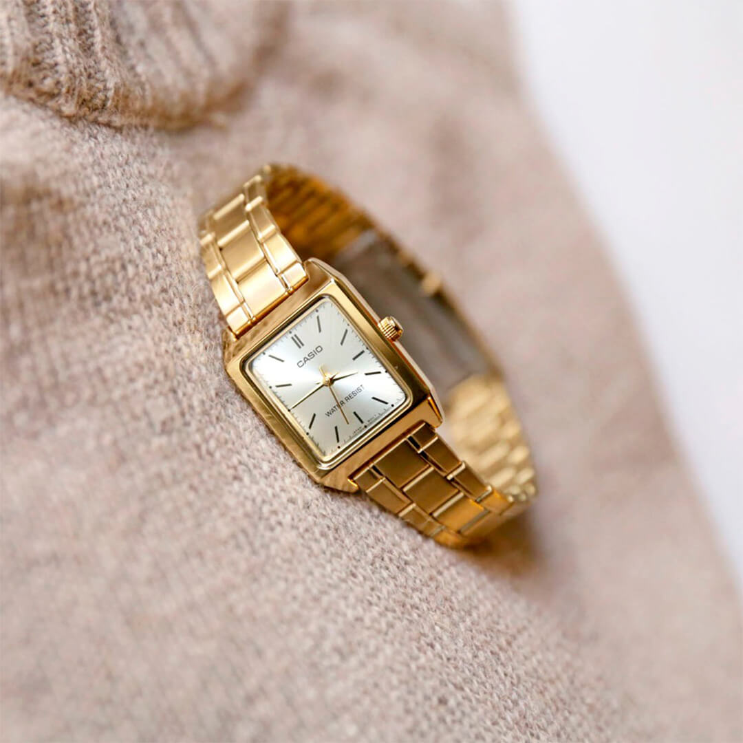 El Casio LTP-V007G-9E es un reloj analógico femenino de diseño clásico y refinado, pensado para quienes buscan una pieza discreta, elegante y funcional para el día a día. Su acabado totalmente dorado con baño de iones aporta una estética sofisticada que combina perfectamente con atuendos formales, ejecutivos y casuales.