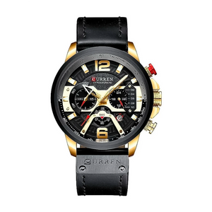 El Curren (CUR-3) para hombre es un reloj deportivo de lujo casual que combina cronógrafo funcional, correa de cuero resistente y un diseño militar moderno. Su esfera azul con detalles en oro rosa, junto a manecillas luminosas, ofrece excelente legibilidad y presencia visual.