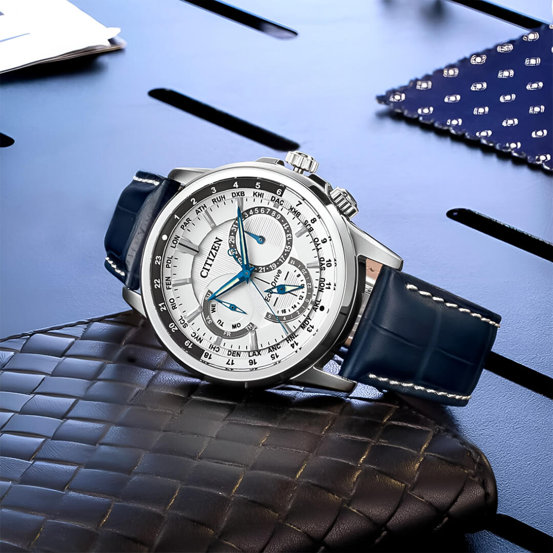 El Citizen Eco Drive BU2020-02A (CIT-4) representa la mezcla ideal de elegancia y utilidad. Pensado para el hombre actual, este reloj exhibe una estructura plateada de acero inoxidable y una correa azul marino que añade un toque distinguido, perfecto para eventos importantes o para el día a día. Su esfera blanca muestra indicadores horarios en tonos azules intensos, junto con subesferas para el día, la fecha y la hora mundial, transformándolo en un accesorio eficiente y con estilo. Aparte, su tecnología Eco-Drive usa la luz solar como fuente de energía, evitando así el reemplazo de pilas.