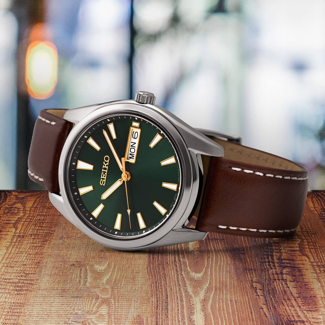 El Reloj Seiko Essentials SUR449 (SEI-32) es una propuesta refinada para quienes buscan un reloj versátil, elegante y técnicamente superior. Su esfera verde con acabado sunray aporta profundidad visual y exclusividad, mientras que los detalles dorados elevan su presencia sin perder sobriedad.