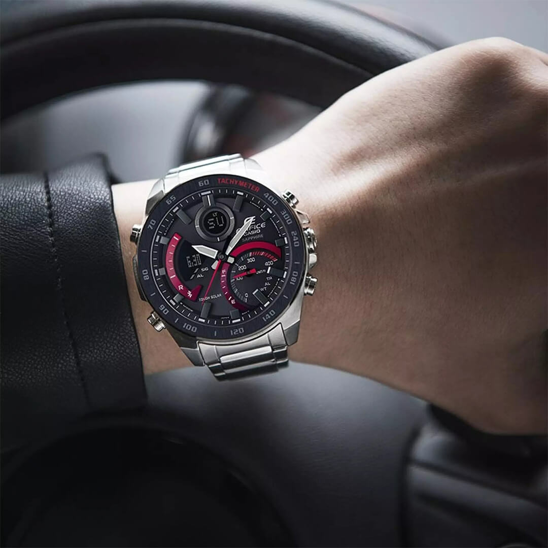 El Edifice ECB-900DB-1A es un reloj híbrido analógico–digital con vinculación Bluetooth, creado para hombres que exigen control total del tiempo, conectividad avanzada y un diseño deportivo de alto impacto. Su estética negra con acentos rojos transmite energía, mientras su tecnología Tough Solar garantiza autonomía inteligente y bajo mantenimiento.
