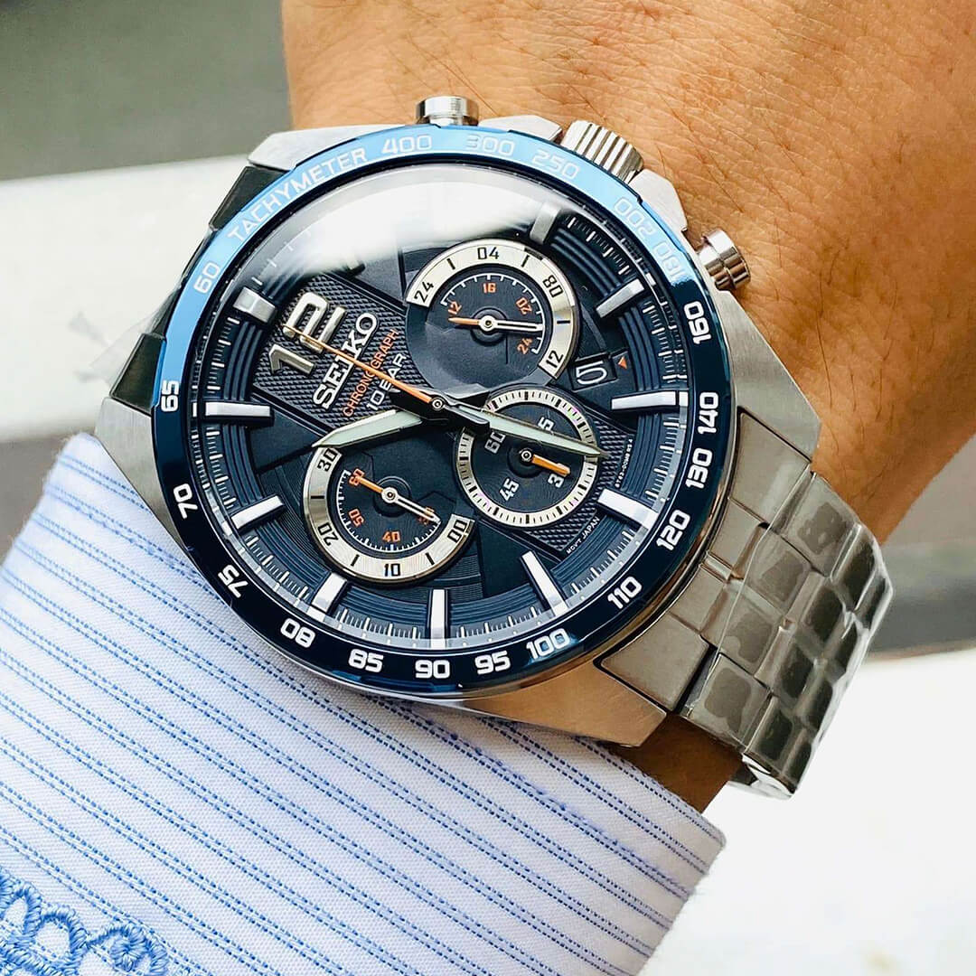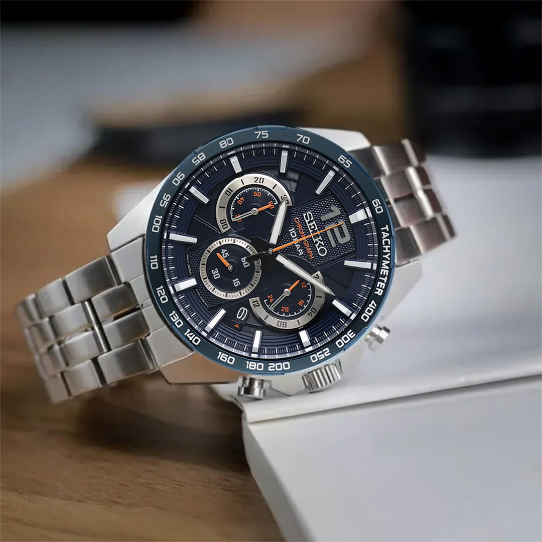 El Seiko SSB345 es la perfecta fusión entre ingeniería japonesa y espíritu deportivo. Inspirado en los tableros de los autos de competición, este cronógrafo de la Colección Esencial destaca por su esfera azul multicapa con relieves metálicos y detalles en naranja que transmiten dinamismo y energía. Cada línea de su diseño refleja la obsesión de Seiko por el detalle y la precisión, ofreciendo un reloj pensado tanto para la velocidad como para la elegancia diaria.