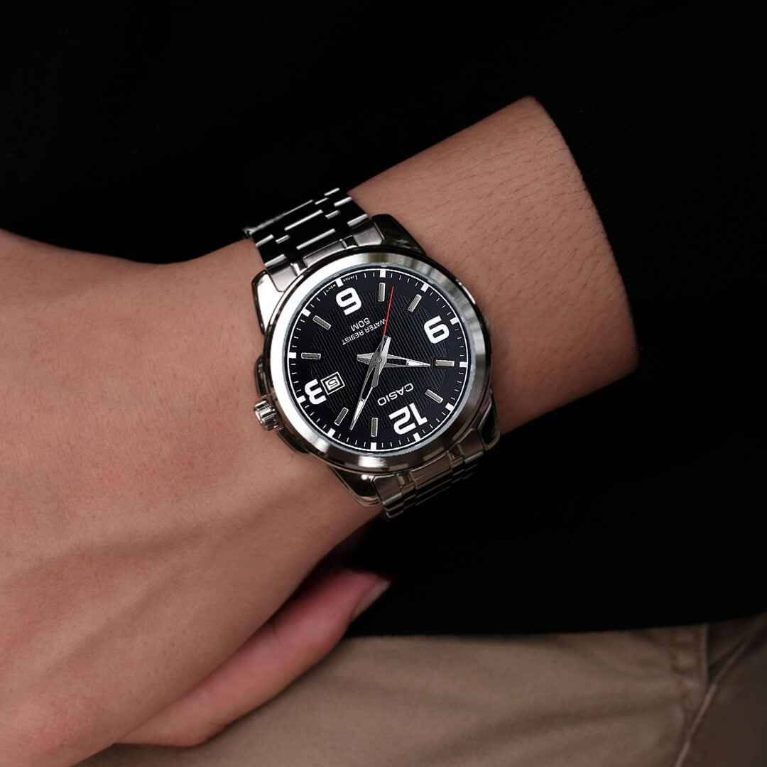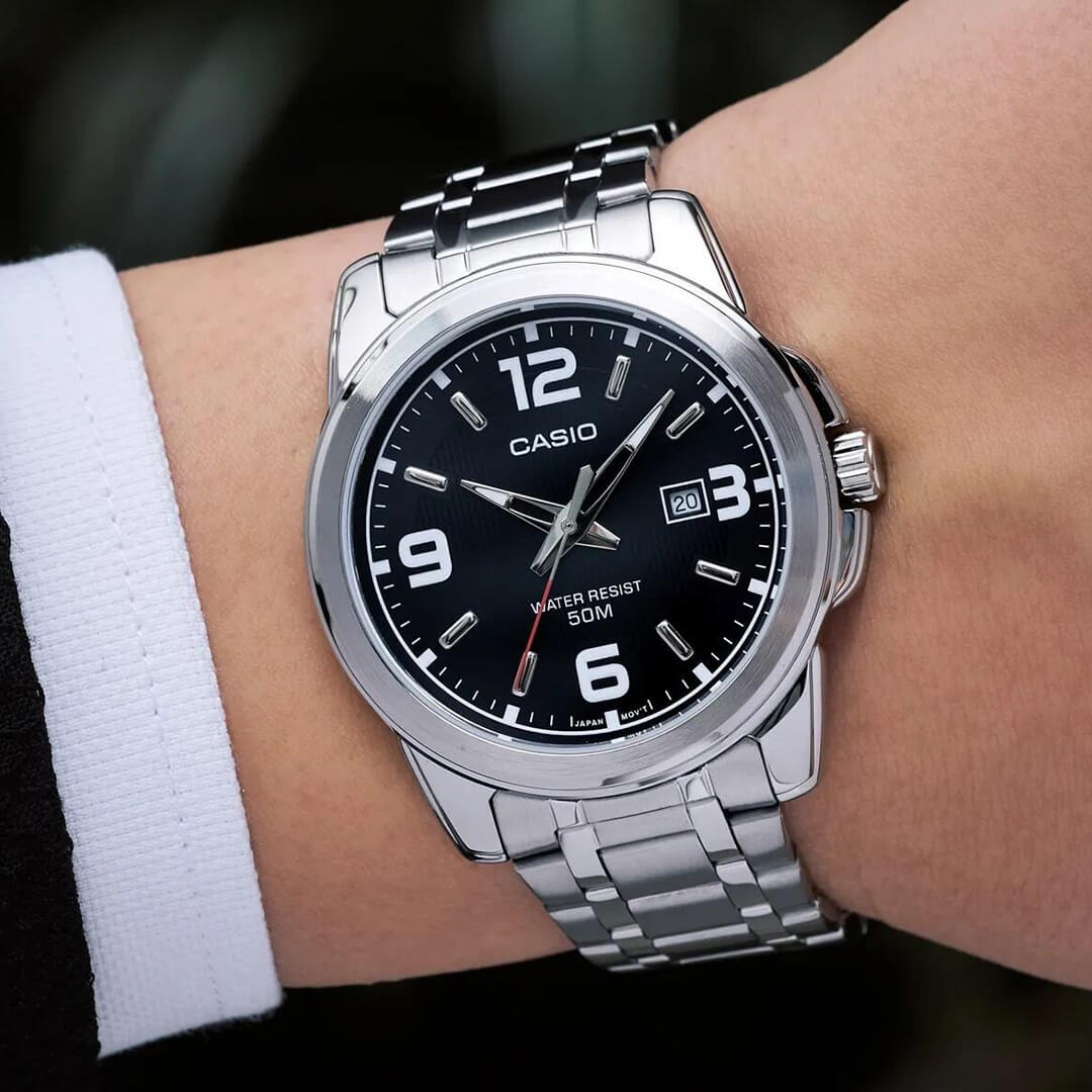 El Casio MTP-1314D-1AV (CAS-144) es un reloj analógico de estilo clásico y funcional, diseñado para quienes priorizan claridad, robustez y confiabilidad en su día a día. Su diseño limpio con números arábigos grandes, pantalla de fecha a las 3 en punto y pulsera de acero inoxidable lo convierten en una opción ideal para uso laboral, formal y cotidiano.