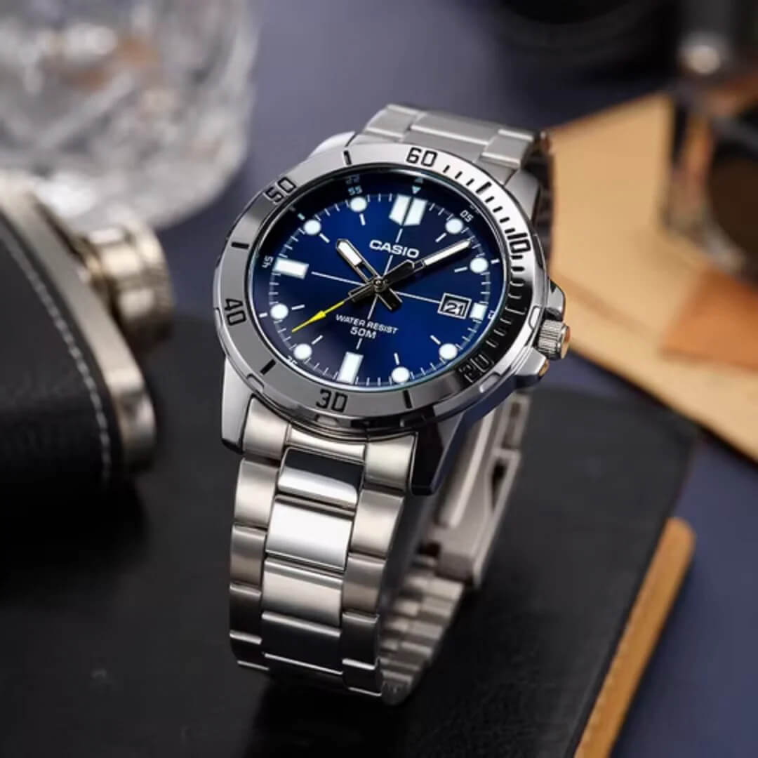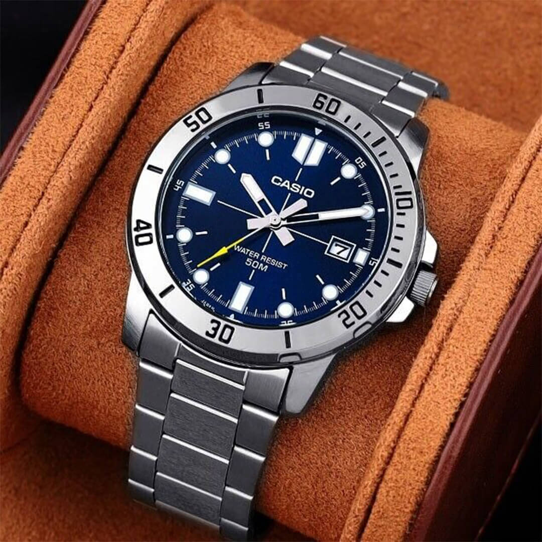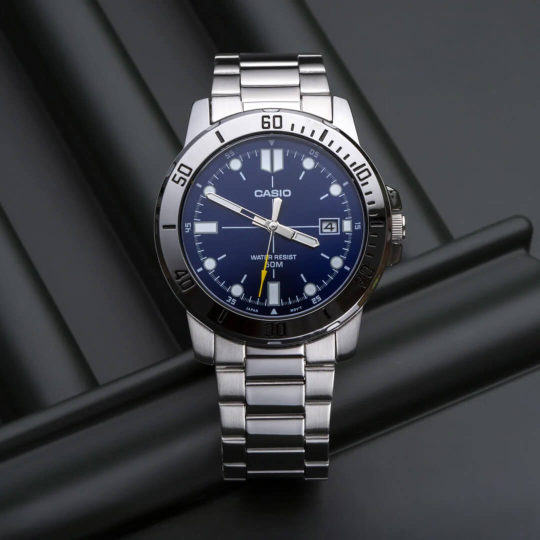 El Casio MTP-VD01D-2E (CAS-73) es un reloj masculino de diseño moderno y funcional, ideal para el uso diario gracias a su combinación de resistencia al agua de 50 metros, correa de acero inoxidable y un dial de alta visibilidad.