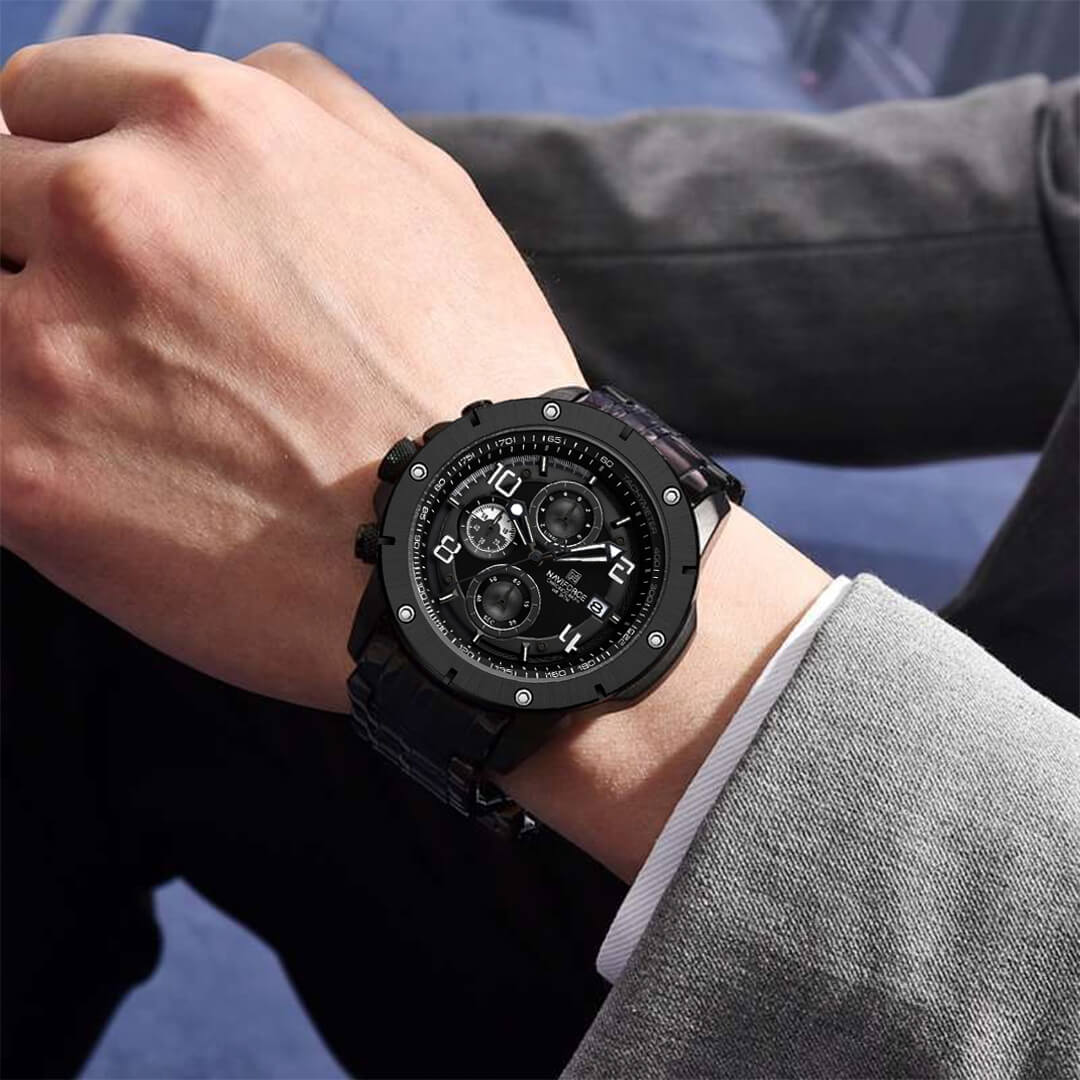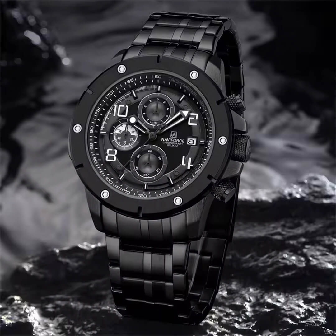 Reloj Naviforce negro NAV-138 de moda con correa de acero inoxidable, 100% original de fábrica, garantía 1 año, el acompañante perfecto para el hombre actual.