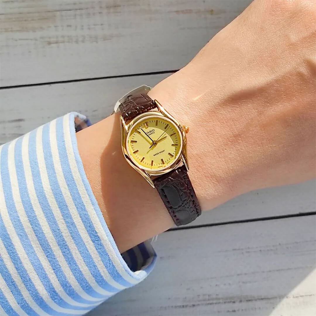 El Casio LTP-1094Q-9A (CAS-M-113) redefine la elegancia sutil en su máxima expresión. Inspirado en los relojes clásicos de pulsera, este modelo fusiona el encanto atemporal del dorado con la sofisticación cálida del cuero marrón, creando un accesorio que resalta por su estilo vintage y versatilidad moderna.