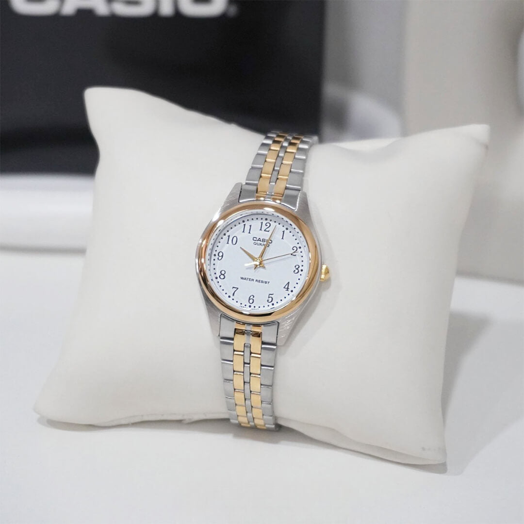 El Casio LTP-1129G-7B (CAS-M-112) es la definición perfecta de elegancia clásica con un toque moderno. Su diseño bicolor —plateado y dorado— combina la sobriedad del acero inoxidable con la calidez del oro, creando una pieza sofisticada que trasciende modas y temporadas.