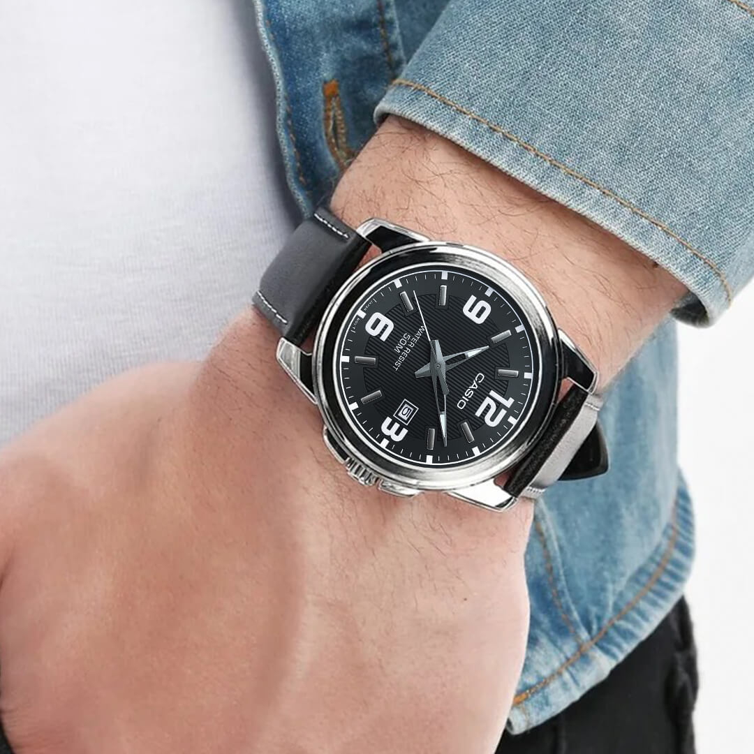 Su tablero negro con números arábigos grandes garantiza una lectura clara y rápida, mientras que su correa de cuero genuino en negro aporta un toque de elegancia sobria. No busca llamar la atención: la conquista con su discreción, su precisión y su fiabilidad legendaria.