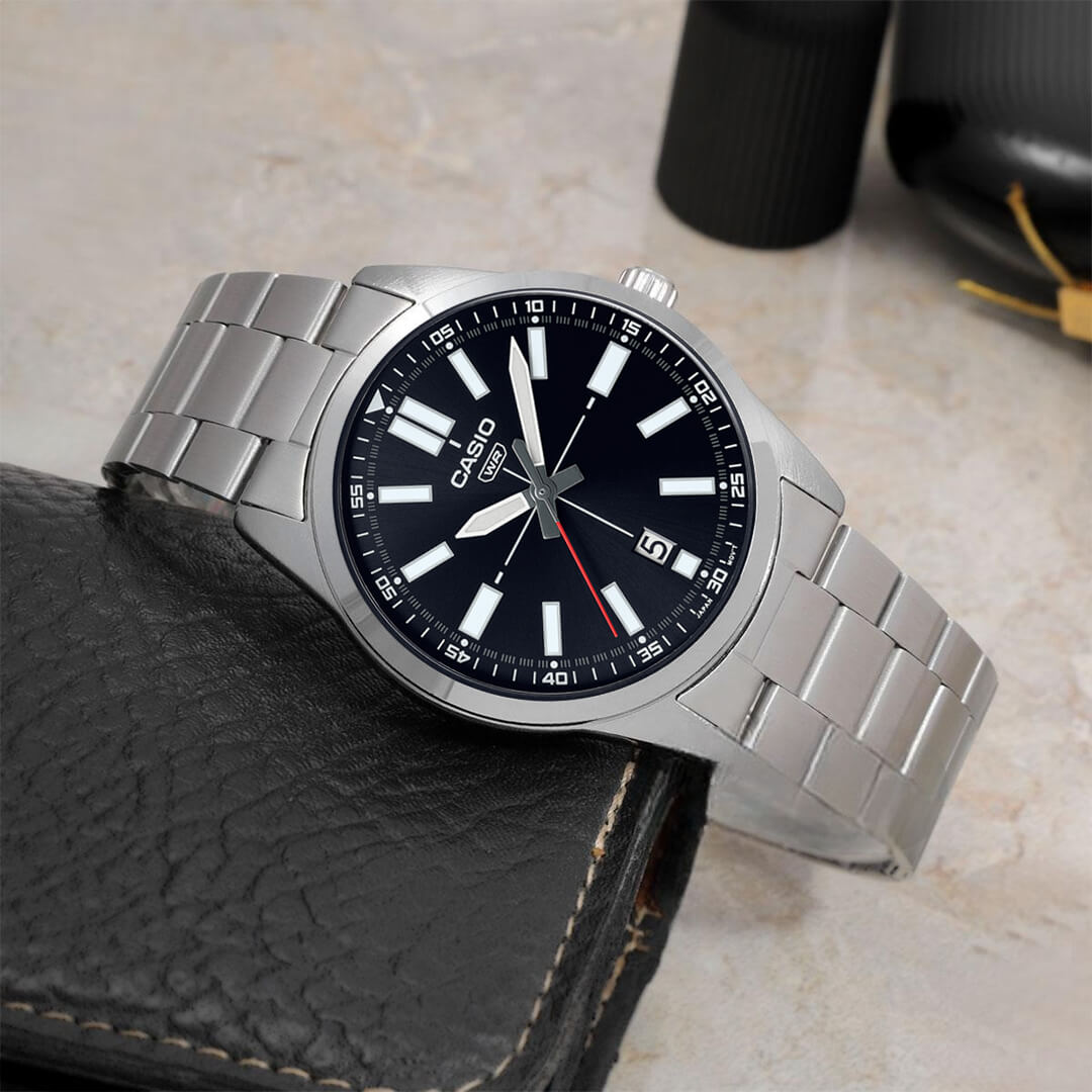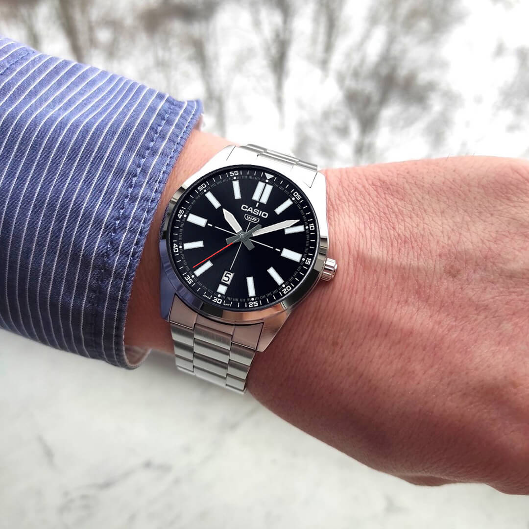 El Casio MTP-VD02D-1E (CAS-26) representa el equilibrio perfecto entre elegancia clásica y espíritu deportivo. Su diseño analógico minimalista con esfera negra y caja plateada en acero inoxidable transmite fuerza, orden y estilo, mientras que su ventana de fecha a las 6 agrega una funcionalidad práctica sin comprometer la estética.