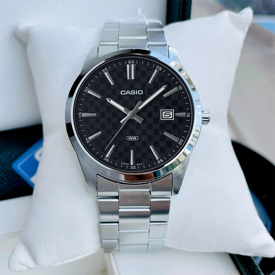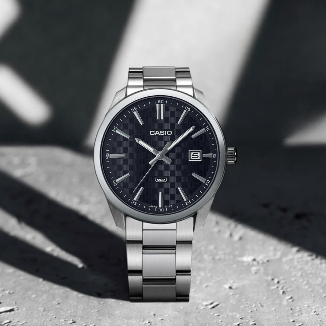 El Casio MTP-VD03D-1A (CAS-32) es la redefinición del estilo minimalista masculino. Su esfera negra intensa, en contraste con la caja y correa de acero inoxidable, crea una presencia visual poderosa que comunica seguridad, estilo y distinción.