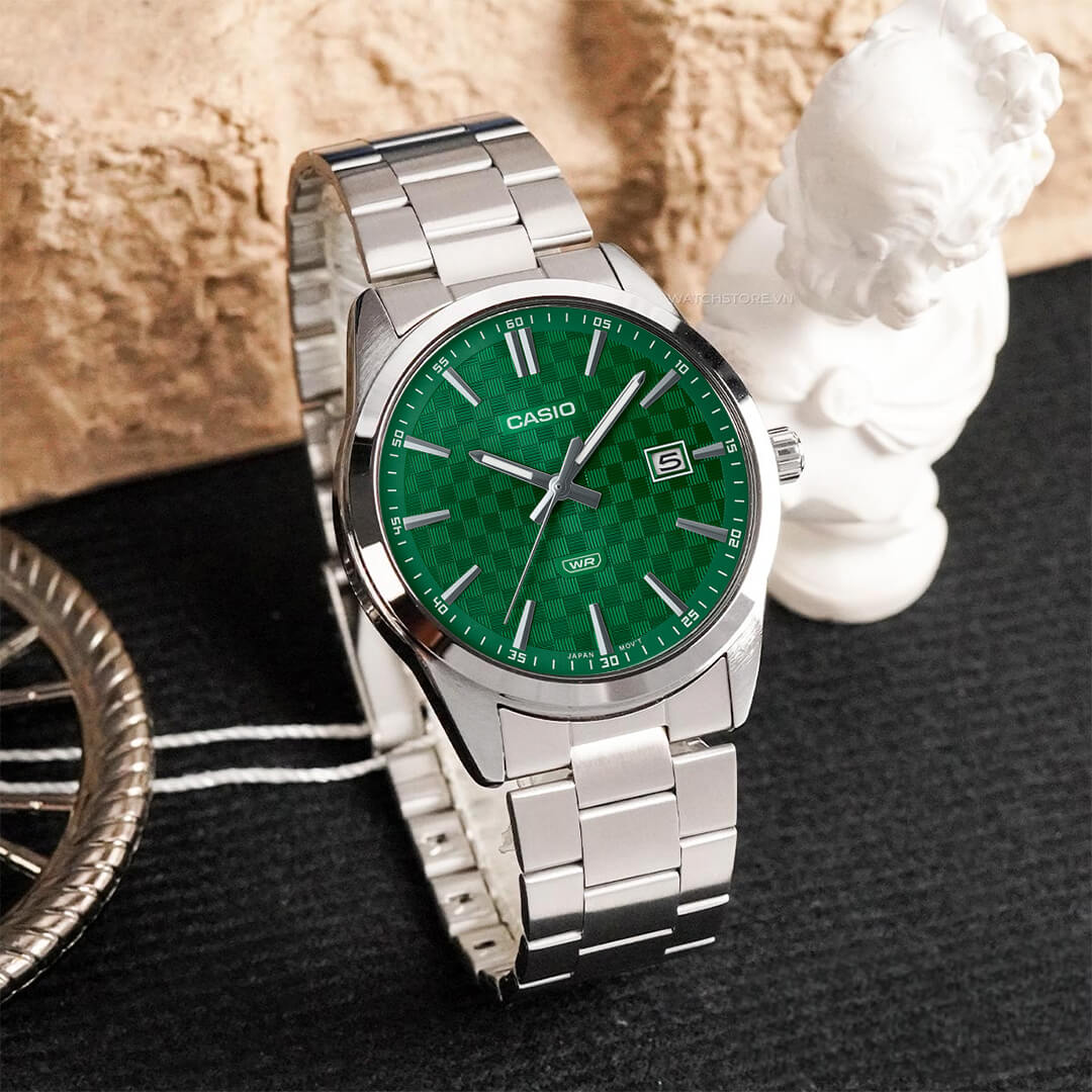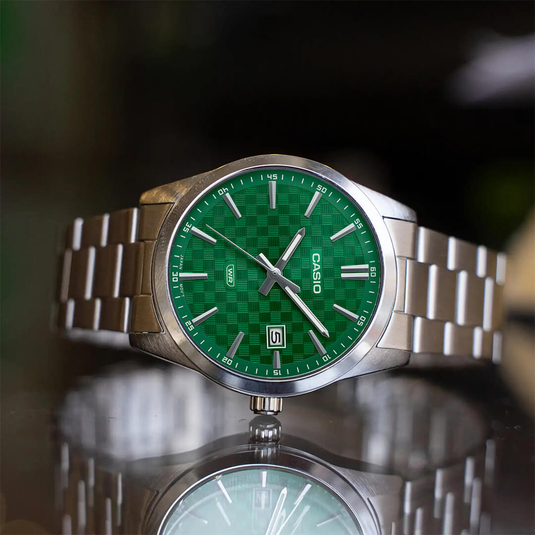 El Casio MTP-VD03D-3A1 (CAS-33) es la redefinición del estilo minimalista masculino. Su esfera verde intenso, en contraste con la caja y correa de acero inoxidable, crea una presencia visual poderosa que comunica seguridad, estilo y distinción.