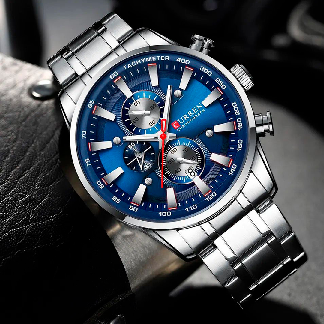 Su esfera azul con detalles plateados y manecillas luminosas aporta una estética sofisticada sin sacrificar legibilidad. Un reloj versátil, pensado para hombres activos que necesitan un accesorio confiable tanto en el trabajo como en su tiempo libre.