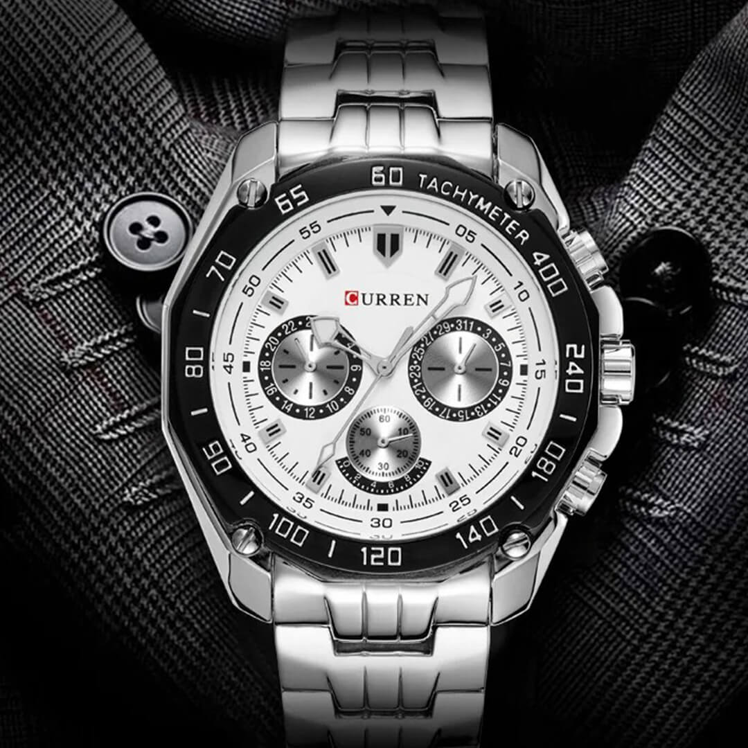 El Reloj Curren (CUR-57) para hombre es un reloj de cuarzo deportivo-militar que combina acero inoxidable, diseño robusto y alta legibilidad. Su esfera blanca con subesferas decorativas refuerza una estética técnica y moderna, ideal para el uso diario, oficina o estilo casual.