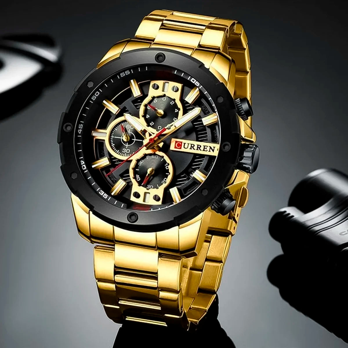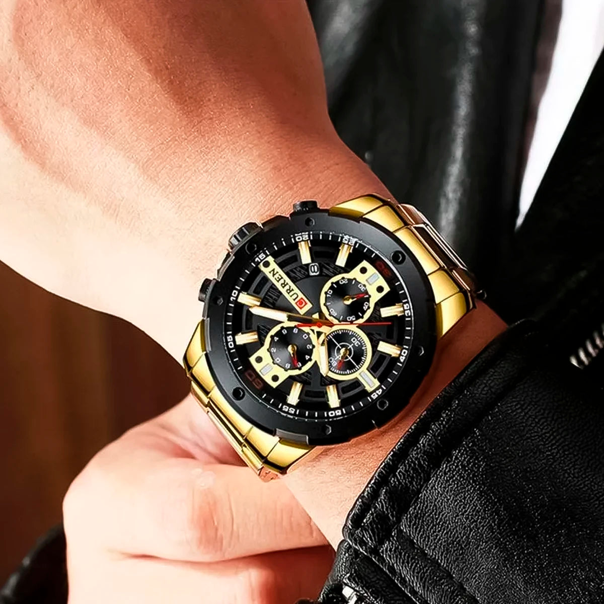 Reloj Curren Elegante Dorado-Negro CUR-42 de moda con correa de acero, 100% original de fábrica, garantía 1 año, el acompañante perfecto para el hombre actual.