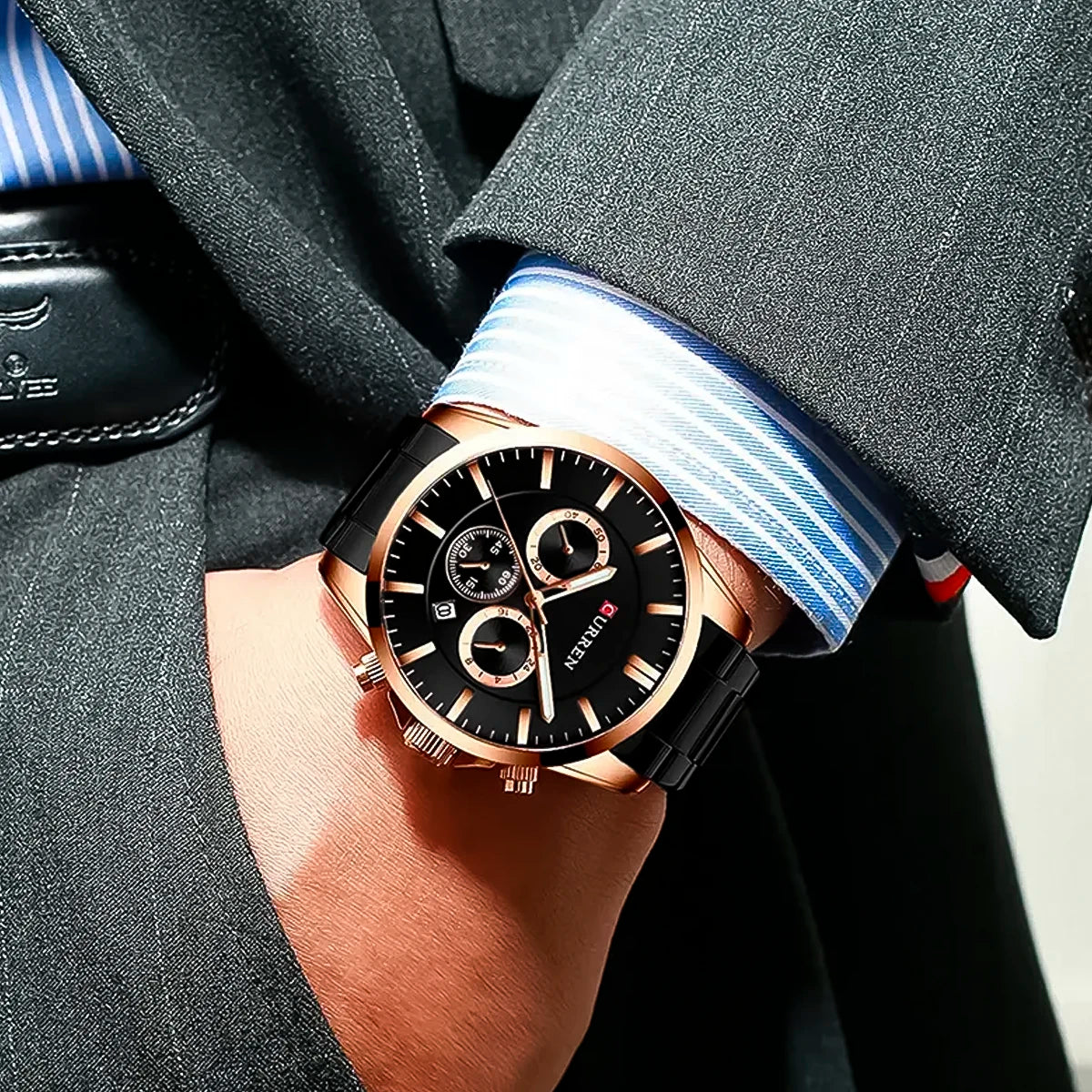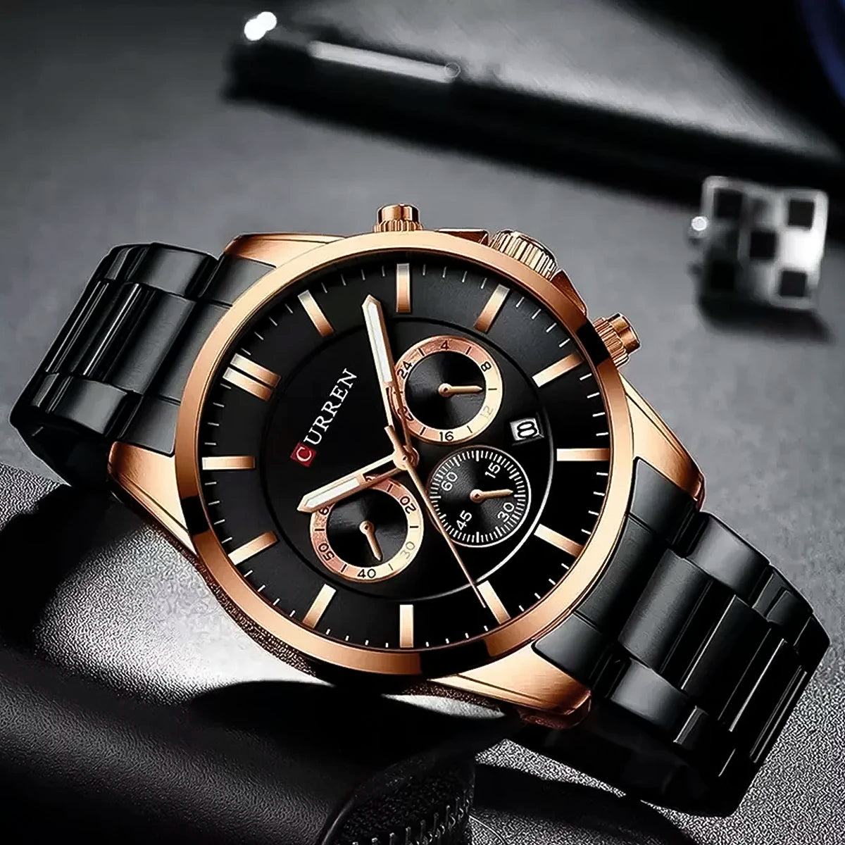 Reloj Curren Elegante Negro con oro rosa CUR-19 de moda con correa de acero, 100% original de fábrica, garantía 1 año, el acompañante perfecto para el hombre actual.