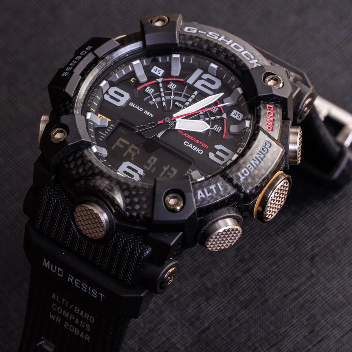 Se trata de un modelo de la serie G-SHOCK Mudmaster, el G-SK-45 cuenta con materiales de carbono y diseñado para su uso en entornos extremos donde abundan los escombros, la suciedad y los residuos. El uso de carbono de alta rigidez en la caja mantiene a raya los daños y la deformación, y garantiza un alto nivel de estanqueidad y resistencia a los golpes.
