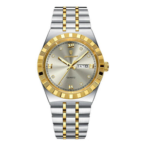 El Poedagar (POE-39) combina el poder del negro con detalles dorado metálico, logrando un estilo sofisticado y moderno que atrae todas las miradas. Diseñado en acero inoxidable y con un tablero negro refinado, este reloj es la declaración de carácter ideal para el hombre actual que busca diferenciarse con clase.