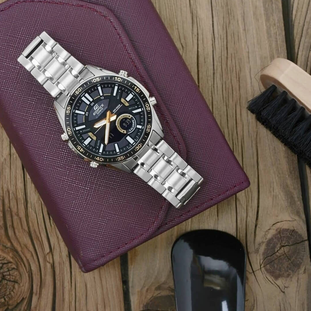 El Edifice EFV-C100D-1B (EDF-15) combina lo mejor del mundo analógico y digital en un formato robusto, elegante y altamente funcional. Diseñado para el hombre moderno que necesita precisión, durabilidad y versatilidad, este modelo destaca por su estética negro metálico con detalles dorados, su resistencia al agua de 100 metros y su extraordinaria autonomía de 10 años de batería.