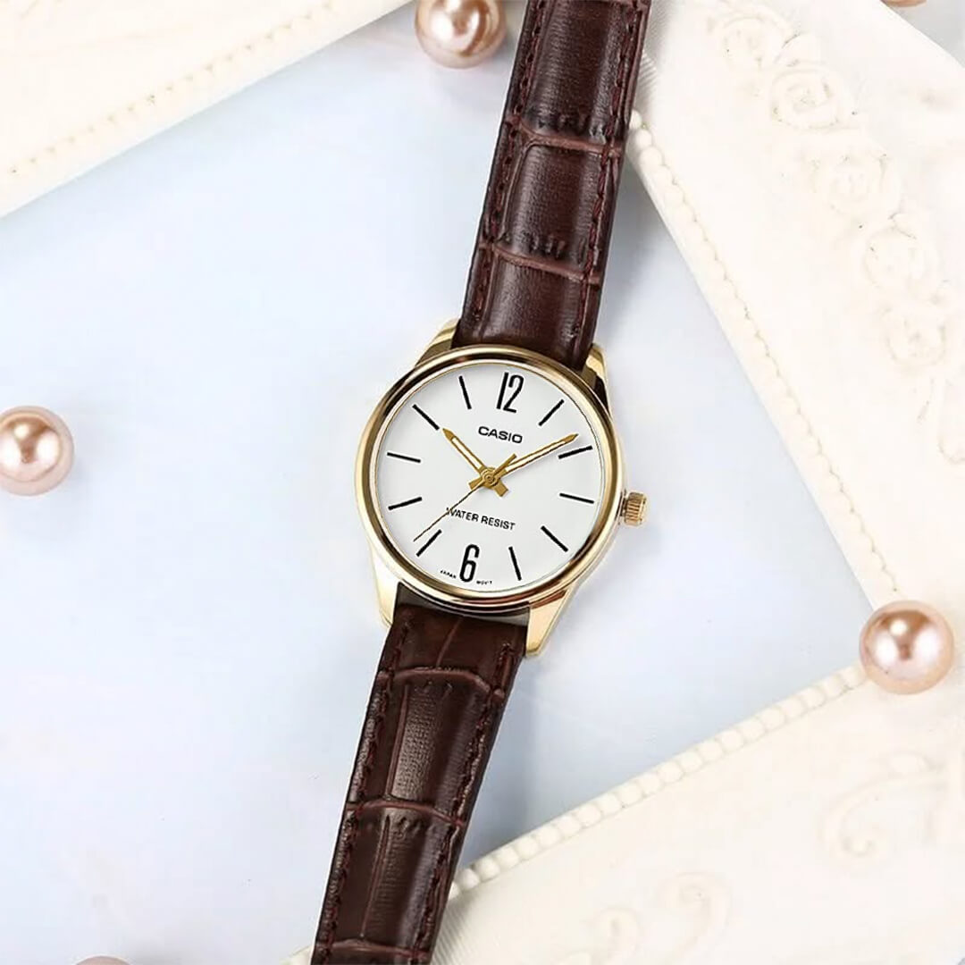 El Casio LTP-V005GL-7BU es un reloj femenino diseñado para quienes priorizan la elegancia atemporal y la simplicidad funcional. Su caja dorada con baño de iones aporta un acabado refinado que complementa la correa de cuero, ofreciendo un estilo sofisticado ideal tanto para ambientes profesionales como casuales.