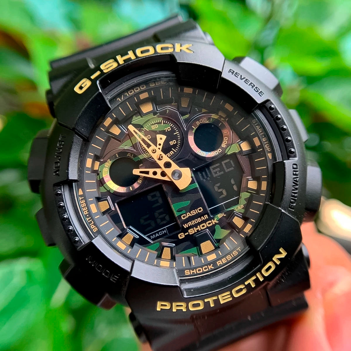 El G-Shock GA-100CF-1A9 es mucho más que un reloj. Diseñado para quienes buscan un estilo audaz con personalidad, este modelo destaca por su carátula con diseño camuflaje y detalles en dorado, combinando estética urbana con la resistencia inigualable de G-Shock.