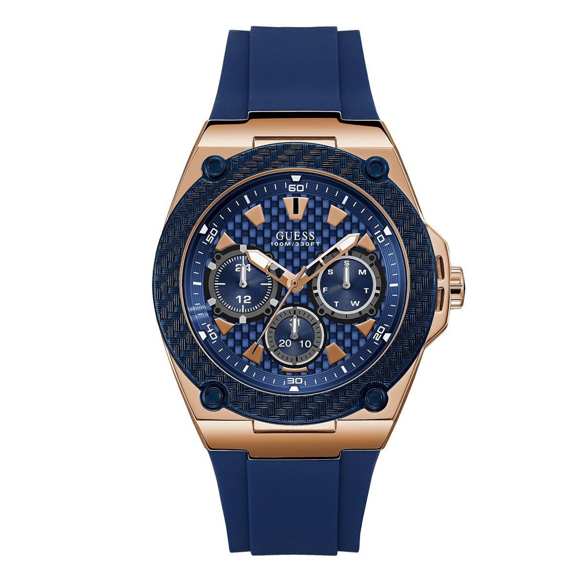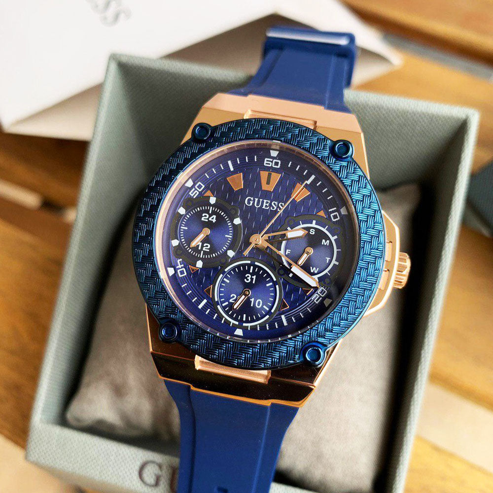 Reloj Guess Silicona Azul con Oro Rosa GUE-8 de moda con correa de silicona, 100% original de fábrica, garantía 1 año, el acompañante perfecto para el hombre actual.