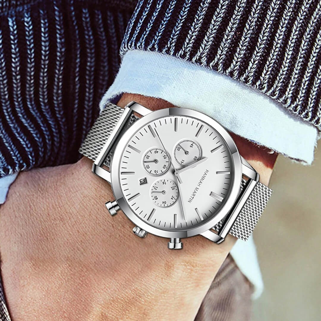 El Hannah Martin (HAN-21) combina estética empresarial con función deportiva. Su diseño plateado-blanco y construcción metálica lo convierten en un reloj versátil: elegante para oficina, resistente para el día a día y con funciones útiles como cronógrafo y calendario. Un modelo que entrega presencia, precisión y durabilidad sin elevar demasiado el costo.
