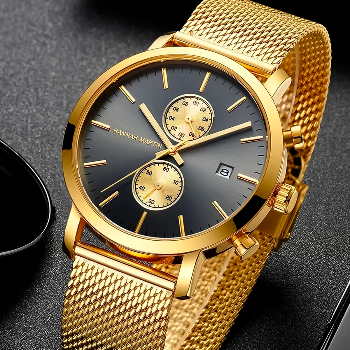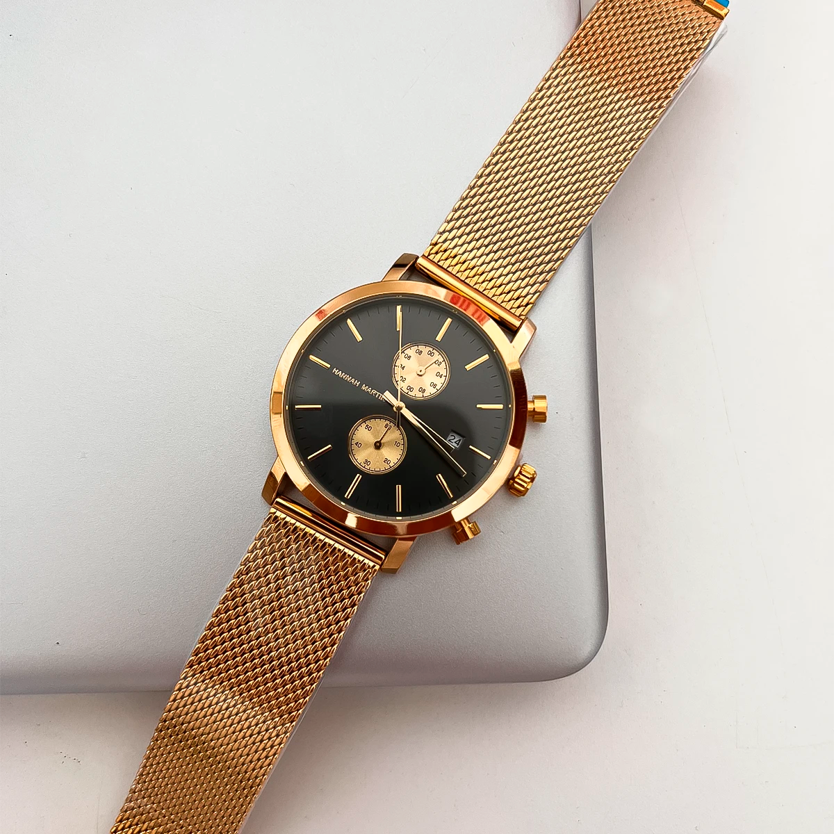 Reloj Hannah Martin malla dorado negro HAN-27 de moda con correa de acero inoxidable, 100% original de fábrica, garantía 1 año, el acompañante perfecto para el hombre actual.