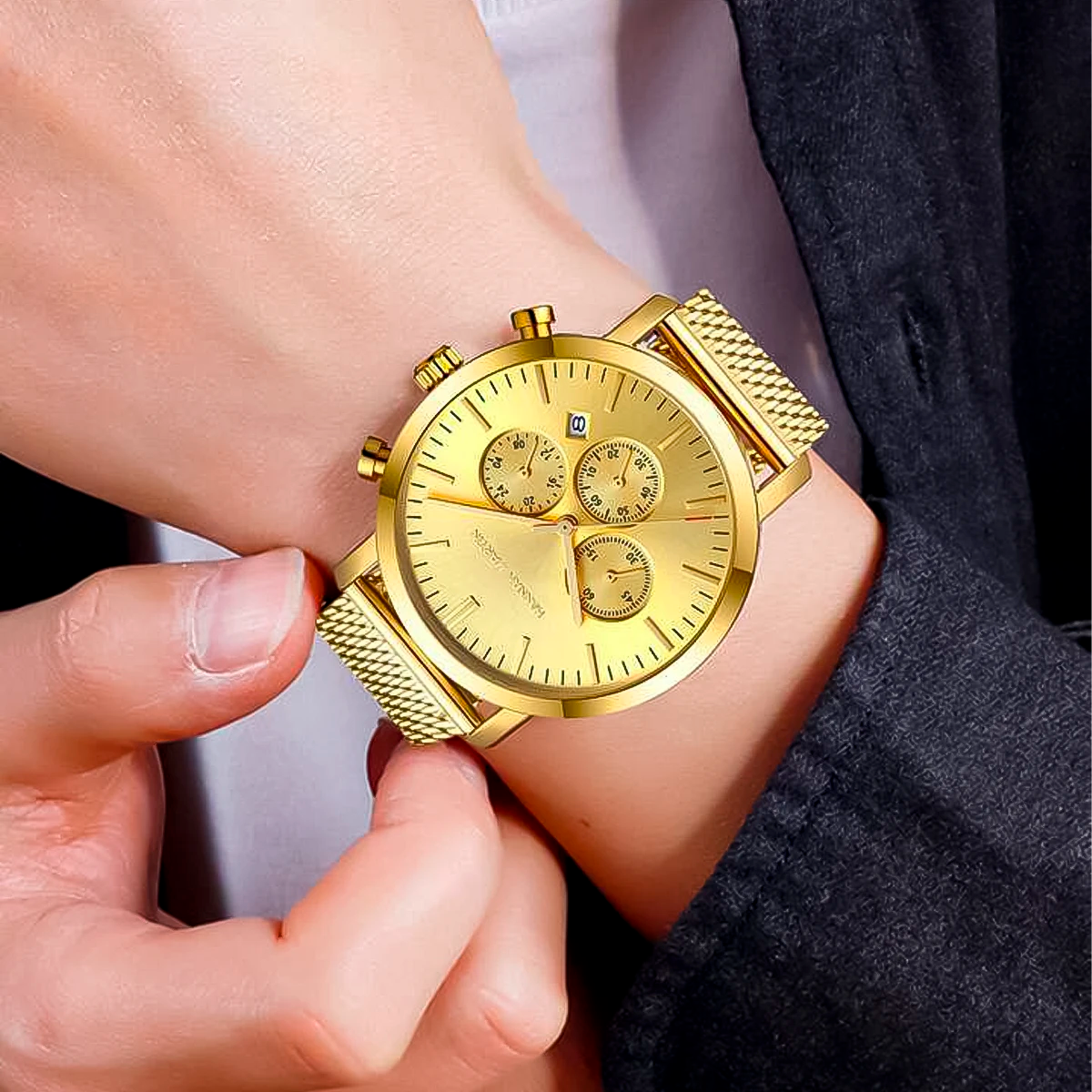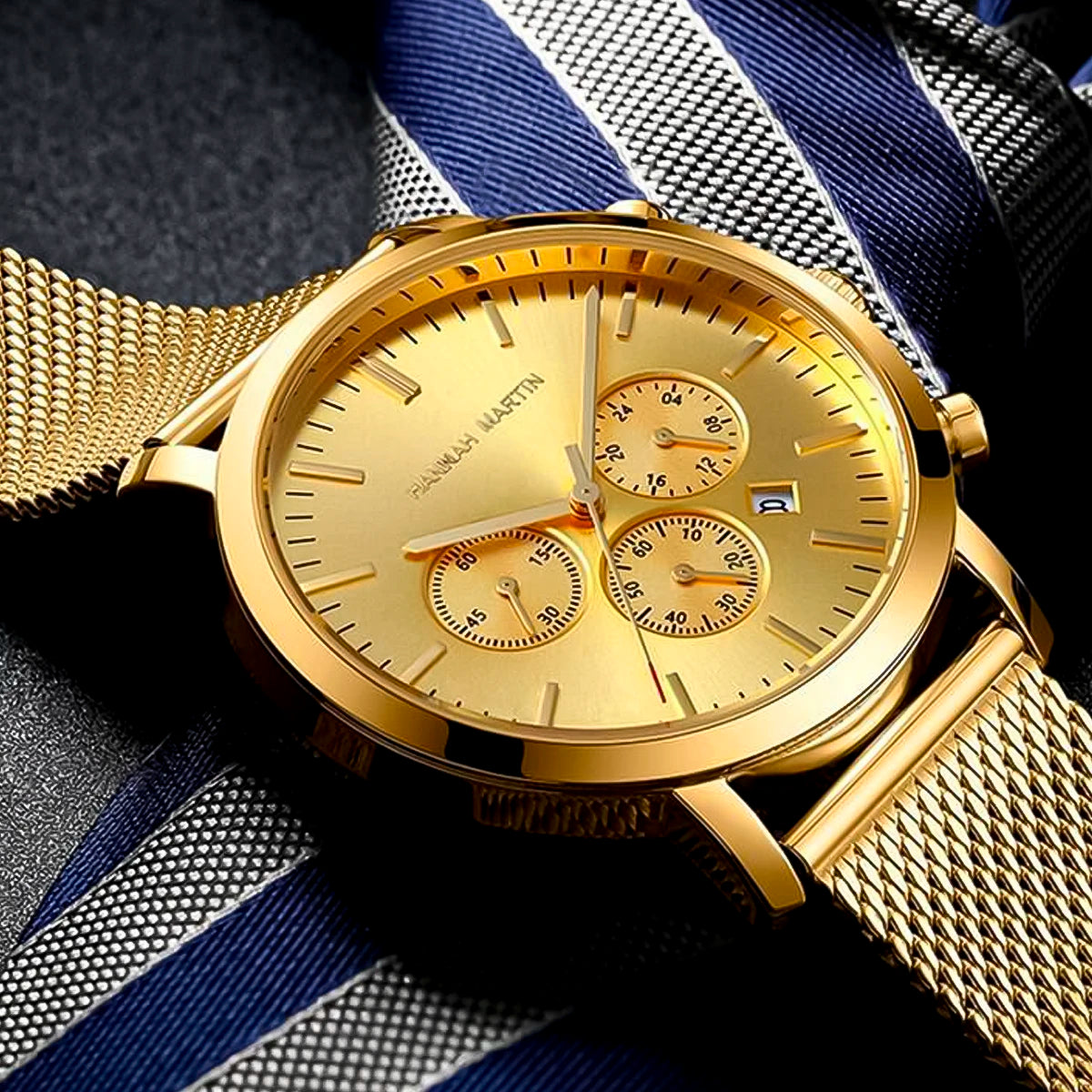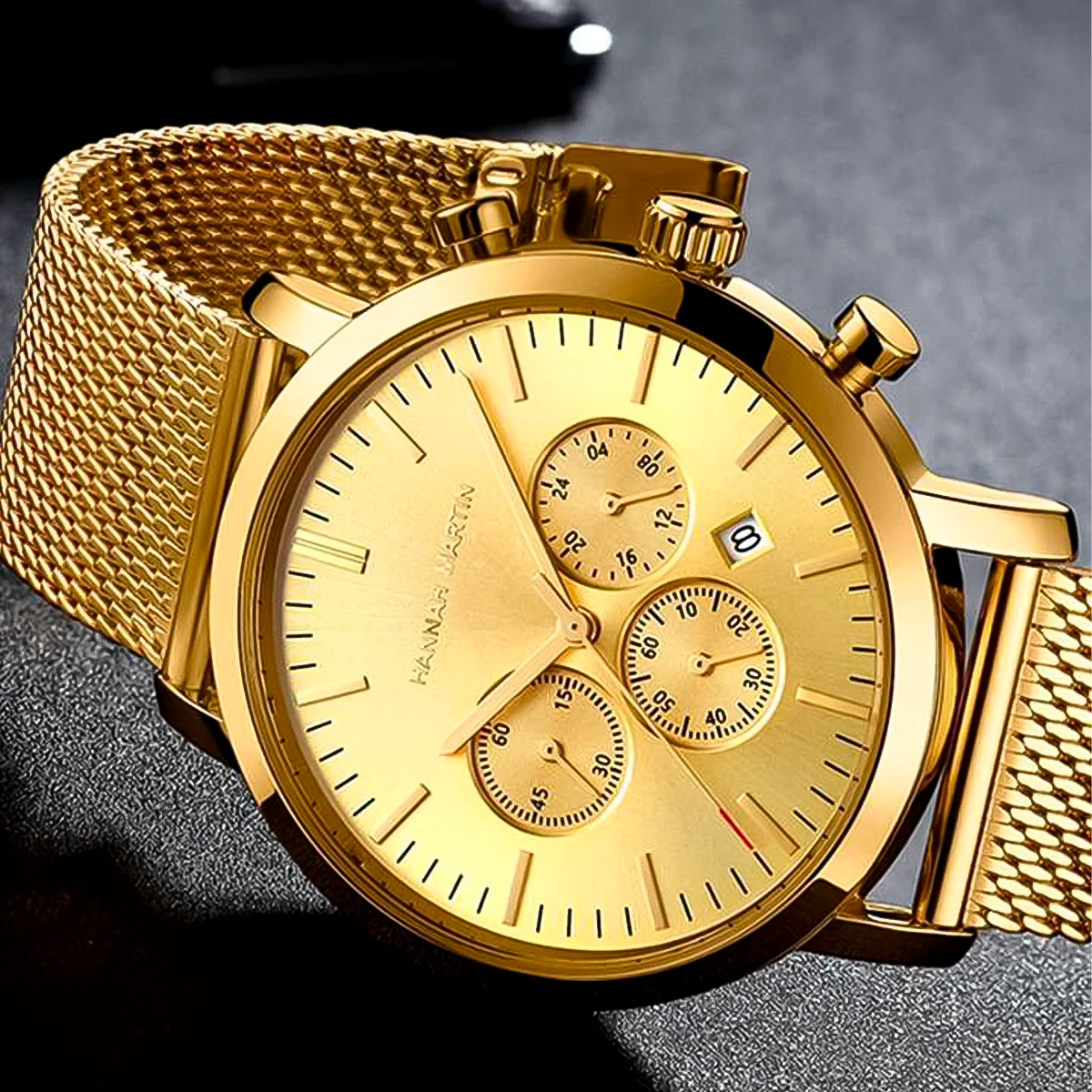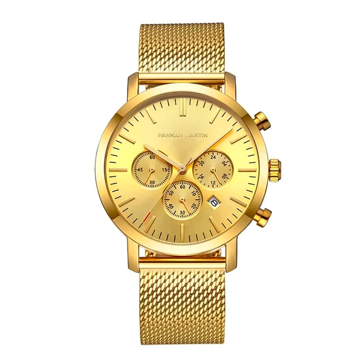 Reloj Hannah Martin malla Dorado HAN-22 de moda con correa de acero inoxidable, 100% original de fábrica, garantía 1 año, el acompañante perfecto para el hombre actual.