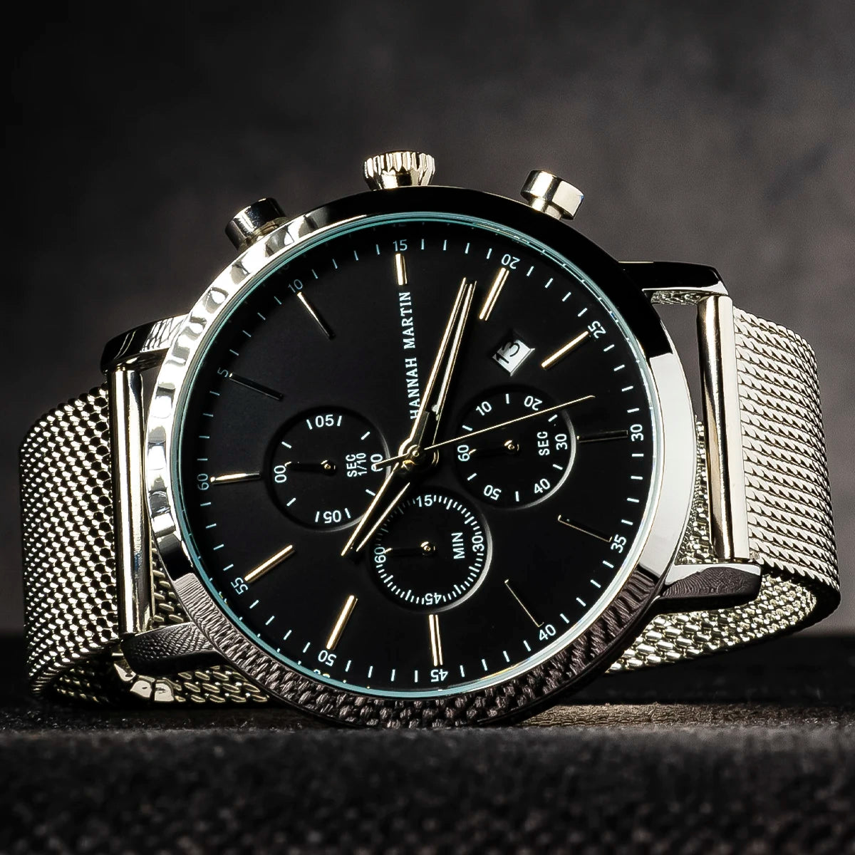 Reloj Hannah Martin malla Plateado negro HAN-23 de moda con correa de acero inoxidable, 100% original de fábrica, garantía 1 año, el acompañante perfecto para el hombre actual.