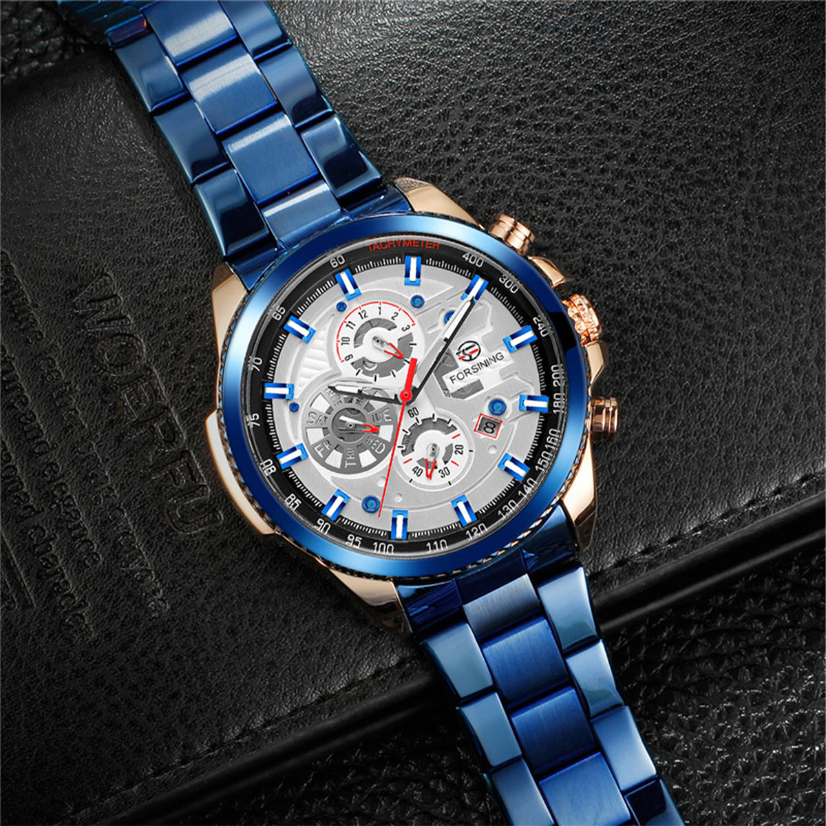 El Forsining (FOR-15) es un reloj que combina la potencia visual de un diseño deportivo, la elegancia del acero inoxidable azul y la ingeniería de un movimiento mecánico automático.