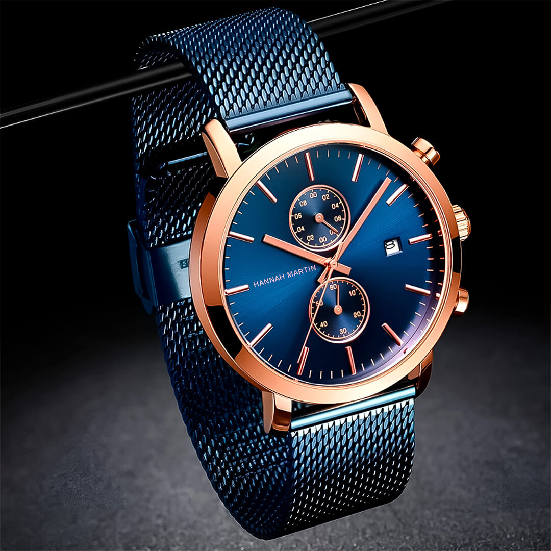 El Hannah Martin (HAN-25) es un reloj que destaca desde el primer vistazo gracias a su sofisticada combinación Azul + Oro Rosa, una estética que equilibra lujo contemporáneo y estilo ejecutivo. Su diseño refinado lo convierte en una pieza ideal para quienes desean proyectar profesionalismo, distinción y carácter sin sacrificar funcionalidad.
