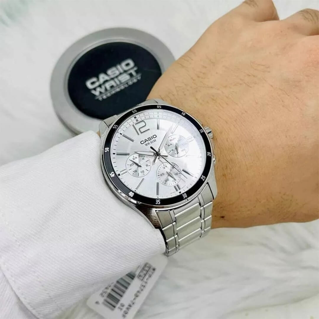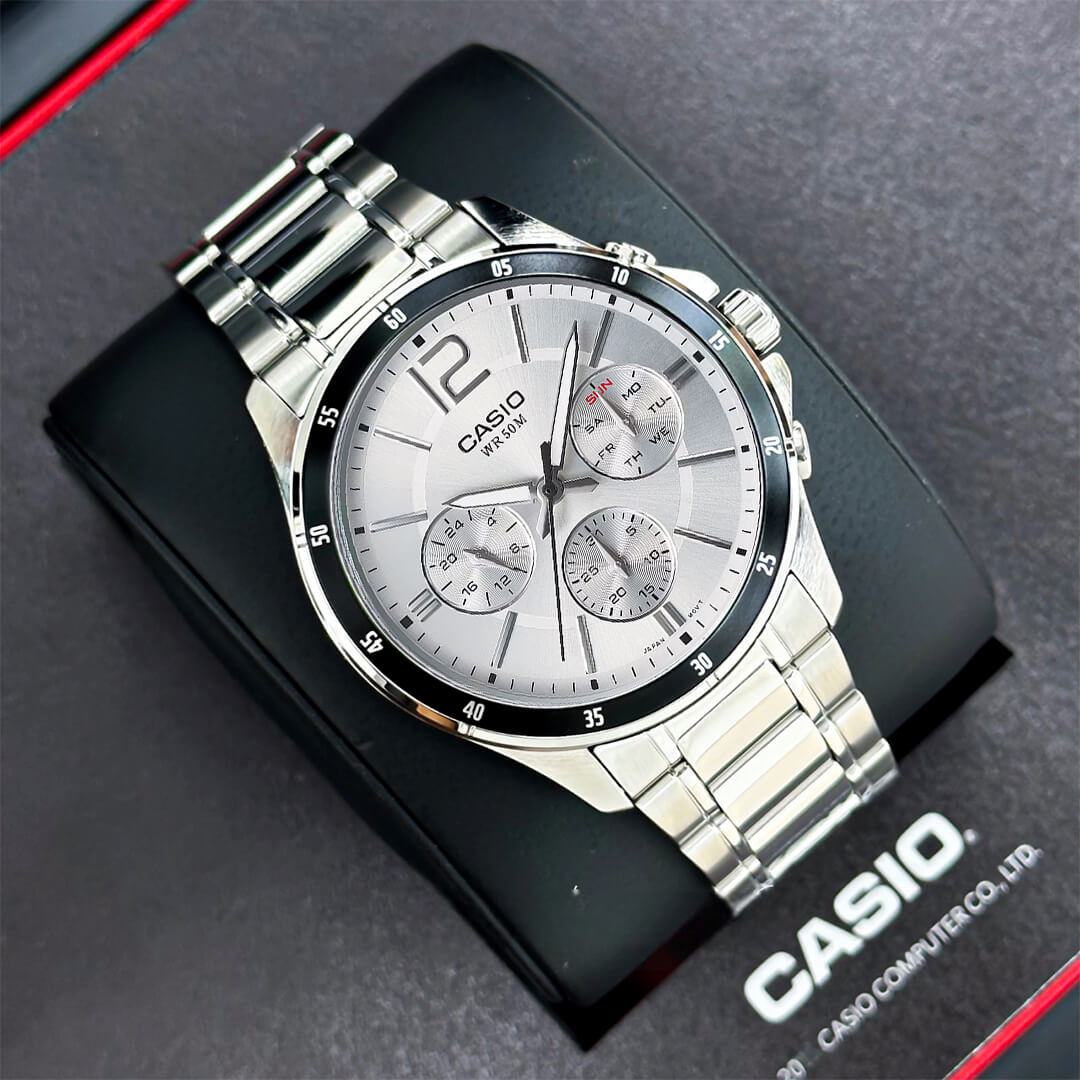 El Casio MTP-1374D-7AV (CAS-50) es un reloj clásico de acero inoxidable que destaca por su diseño sofisticado, su resistencia al agua de 50 metros y sus funciones esenciales para el uso diario. Su estética limpia, reforzada por un cristal mineral duradero y un triple cierre de seguridad, lo convierten en una opción confiable tanto para oficina como para uso casual.