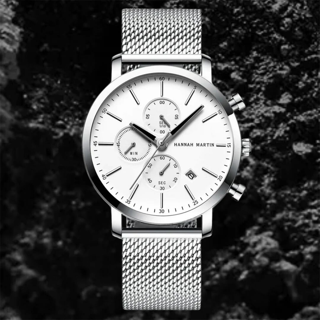 El Hannah Martin (HAN-13) combina estética empresarial con función deportiva. Su diseño plateado-blanco y construcción metálica lo convierten en un reloj versátil: elegante para oficina, resistente para el día a día y con funciones útiles como cronógrafo y calendario.