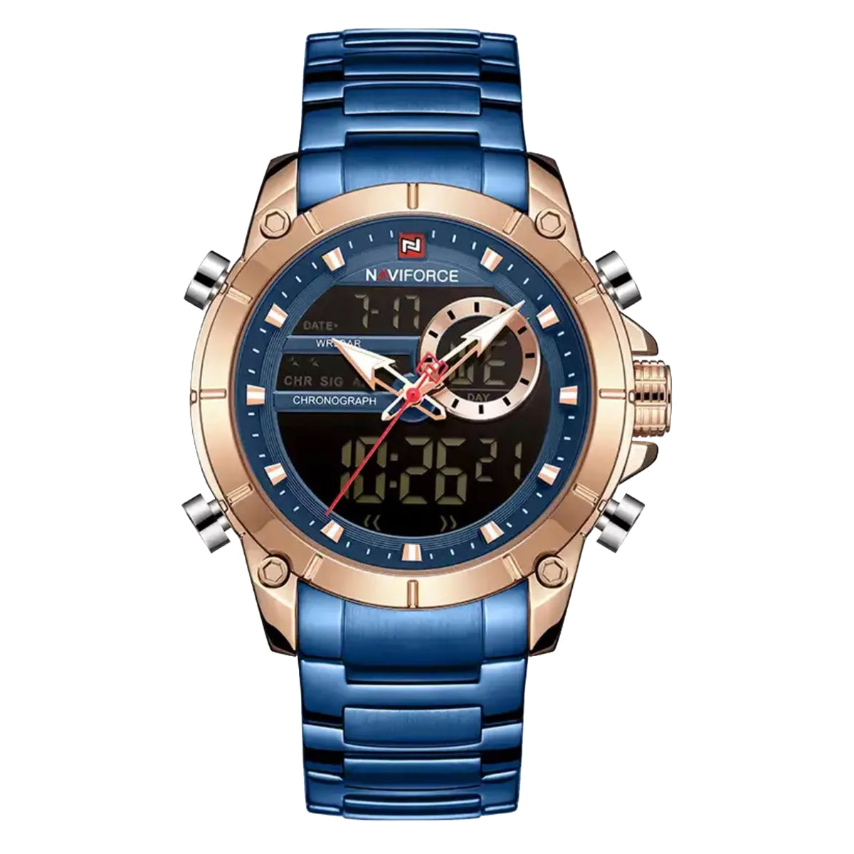 Reloj Naviforce azul oro rosa NAV-79 de moda con correa de acero inoxidable, 100% original de fábrica, garantía 1 año, el acompañante perfecto para el hombre actual.