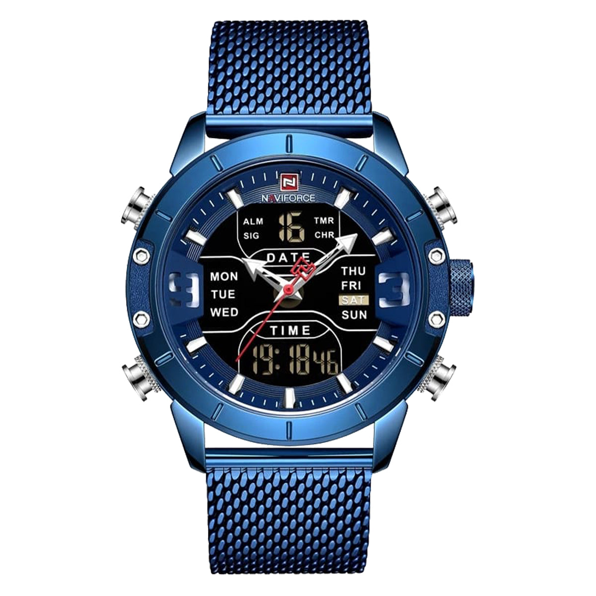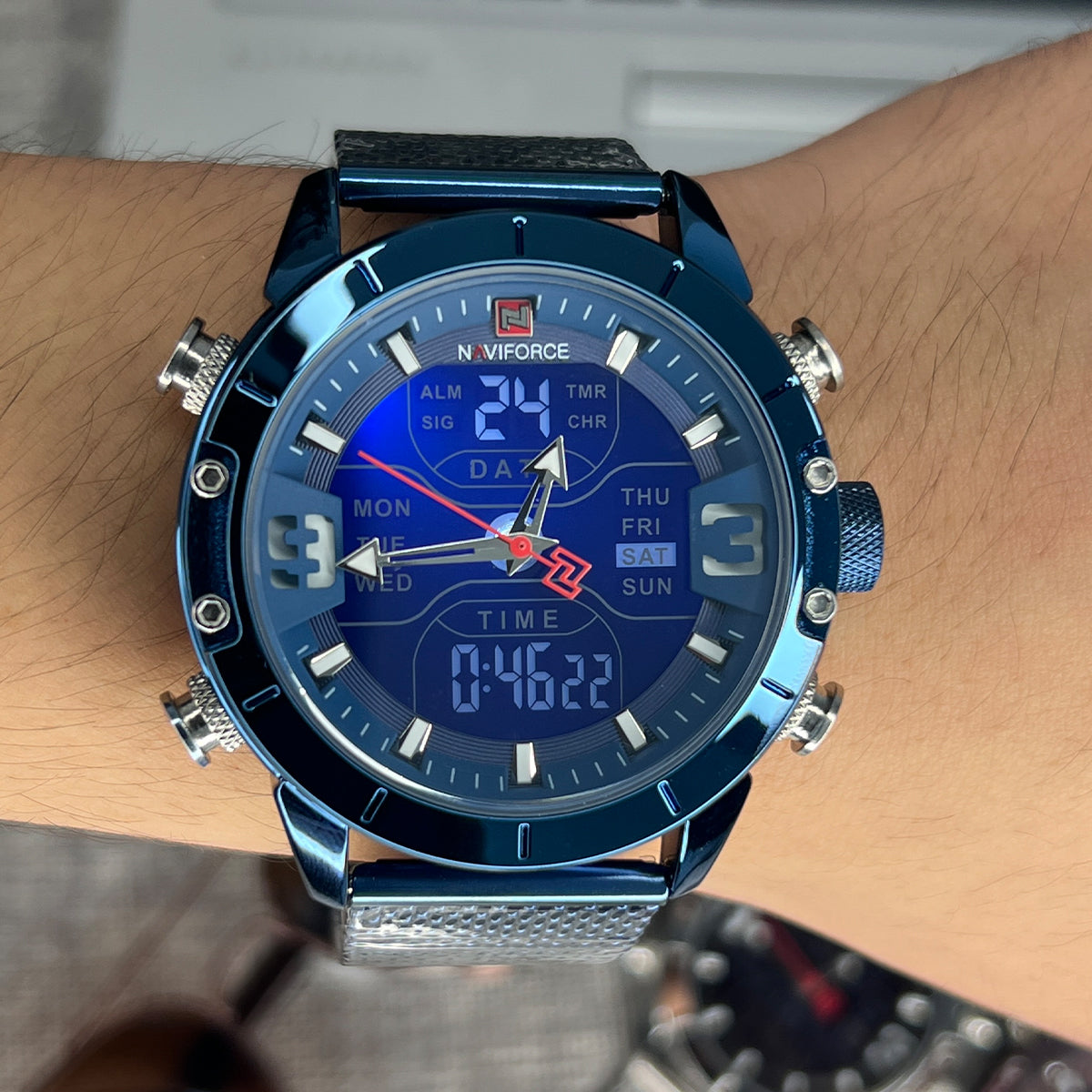 El NAVIFORCE (NAV-3) es un reloj que combina la elegancia del acero inoxidable con la fuerza de un diseño moderno, pensado para el hombre que busca estilo y funcionalidad en un solo accesorio. Su malla azul de acero, tablero negro y caja de 45 mm lo convierten en un reloj imponente, diseñado para destacar en cualquier ocasión.
