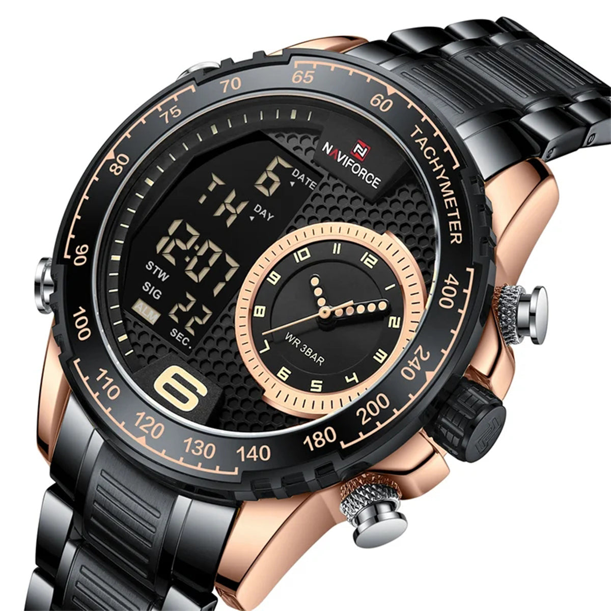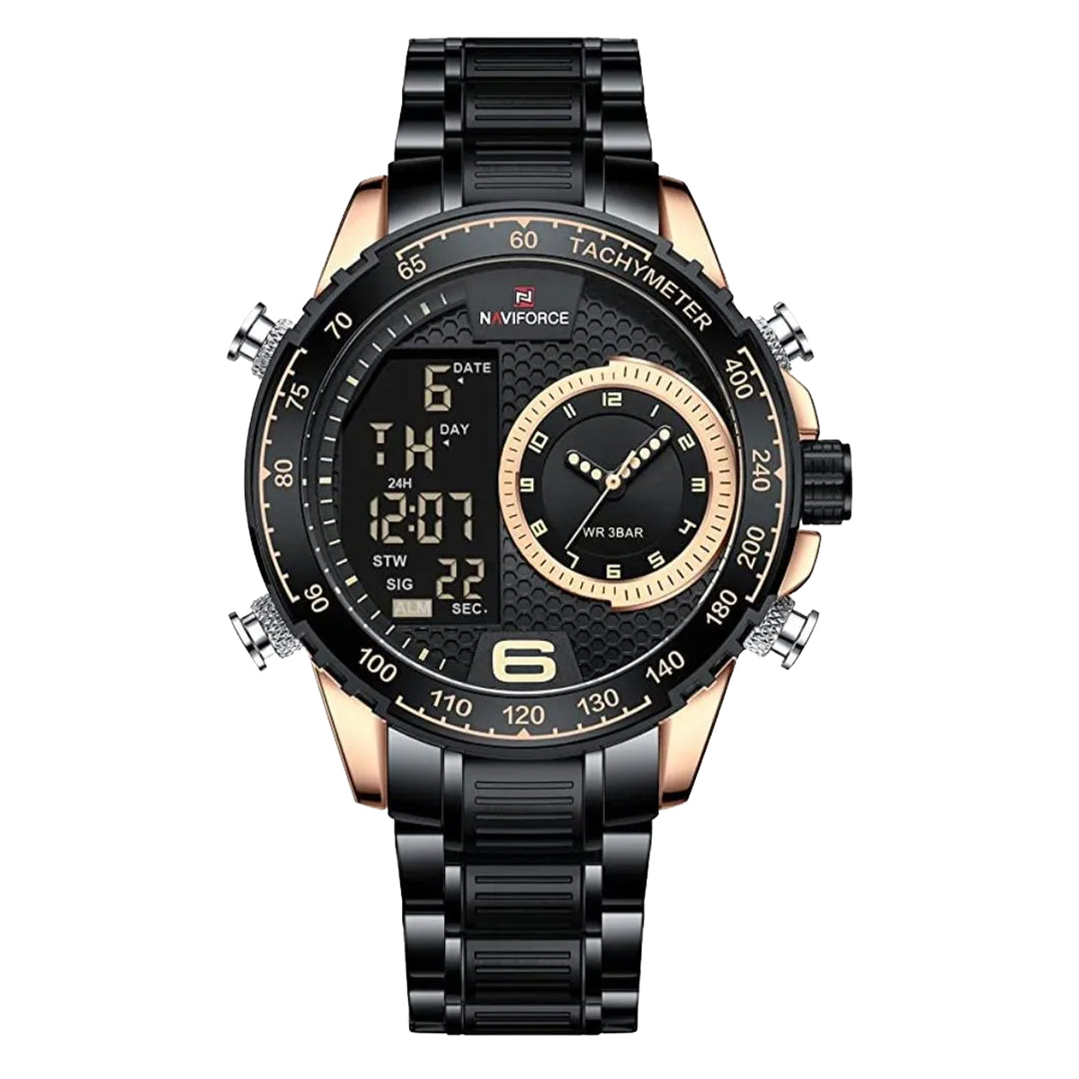 Reloj Naviforce Acero Negro Oro rosa NAV-112 de moda con correa de acero inoxidable, 100% original de fábrica, garantía 1 año, el acompañante perfecto para el hombre actual.