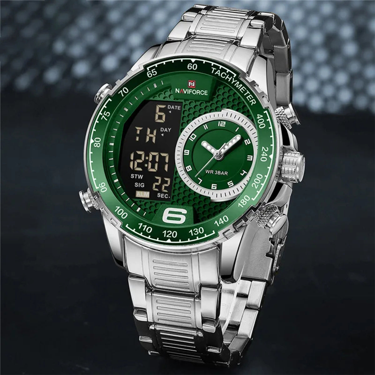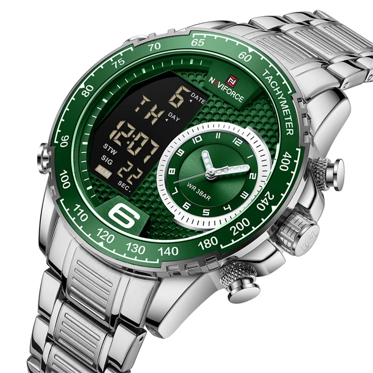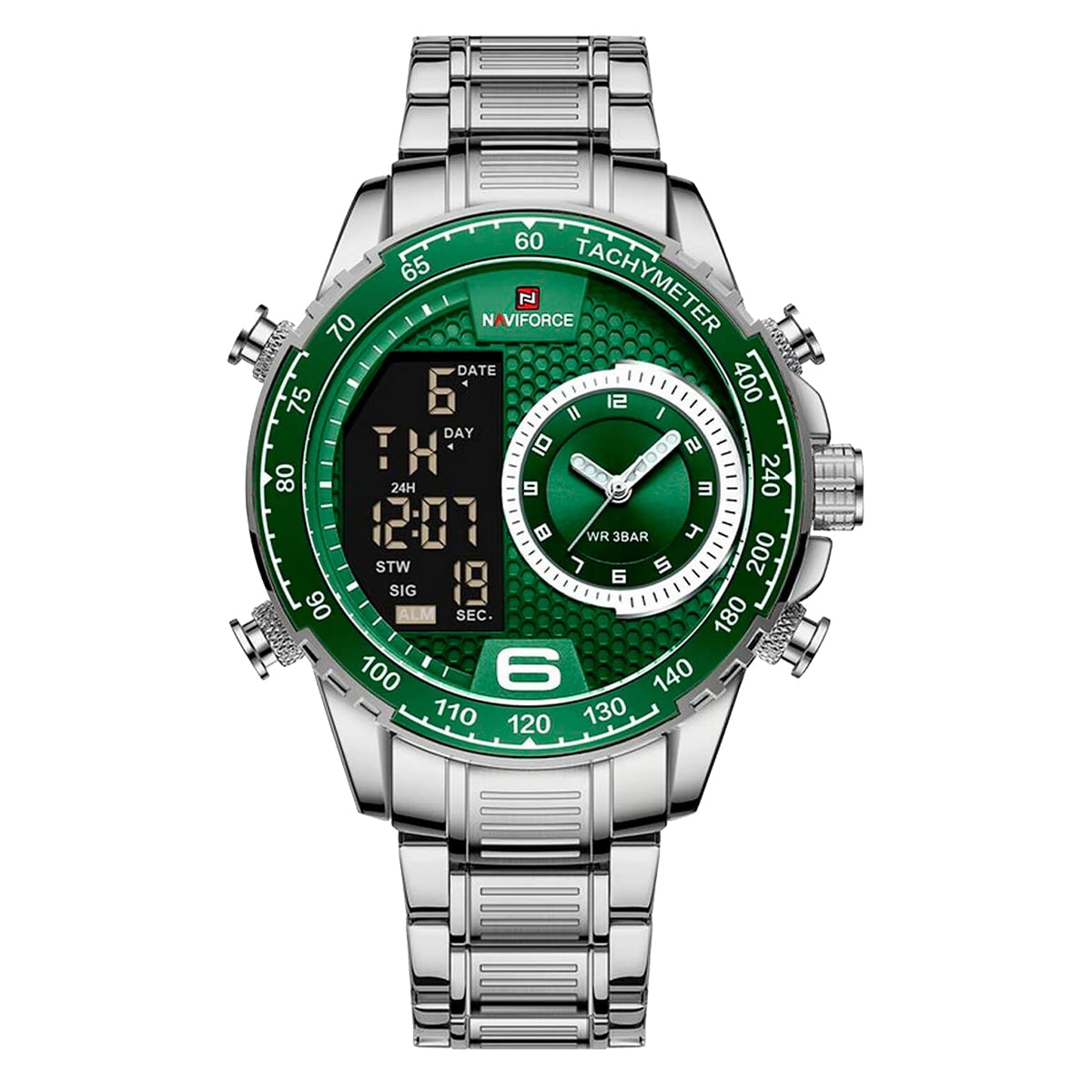 Reloj Naviforce Acero Plateado Verde NAV-109 de moda con correa de acero inoxidable, 100% original de fábrica, garantía 1 año, el acompañante perfecto para el hombre actual.