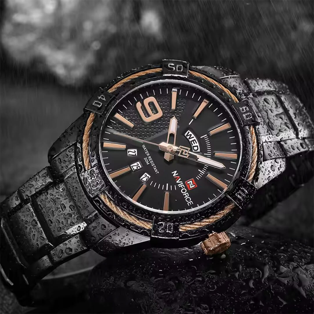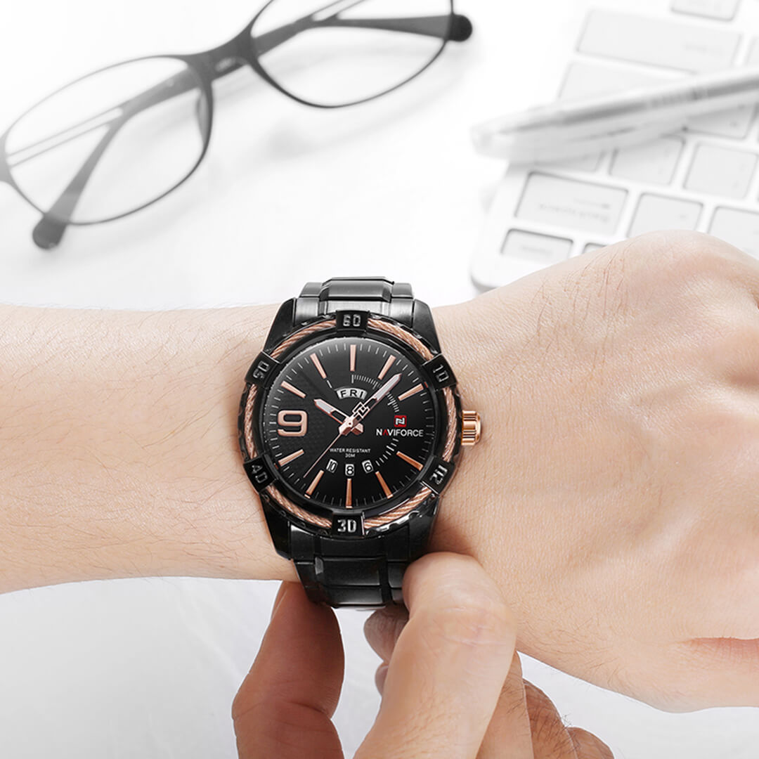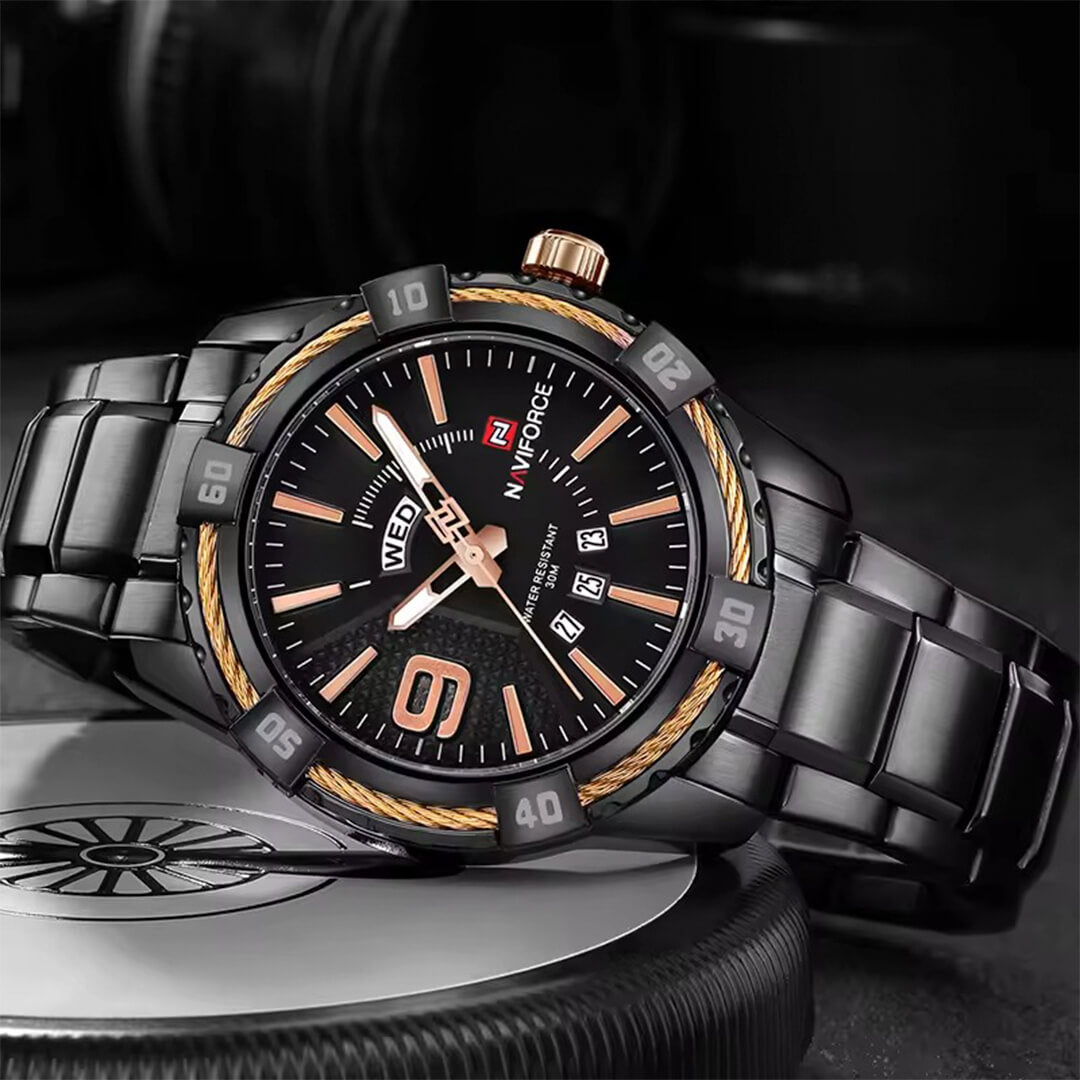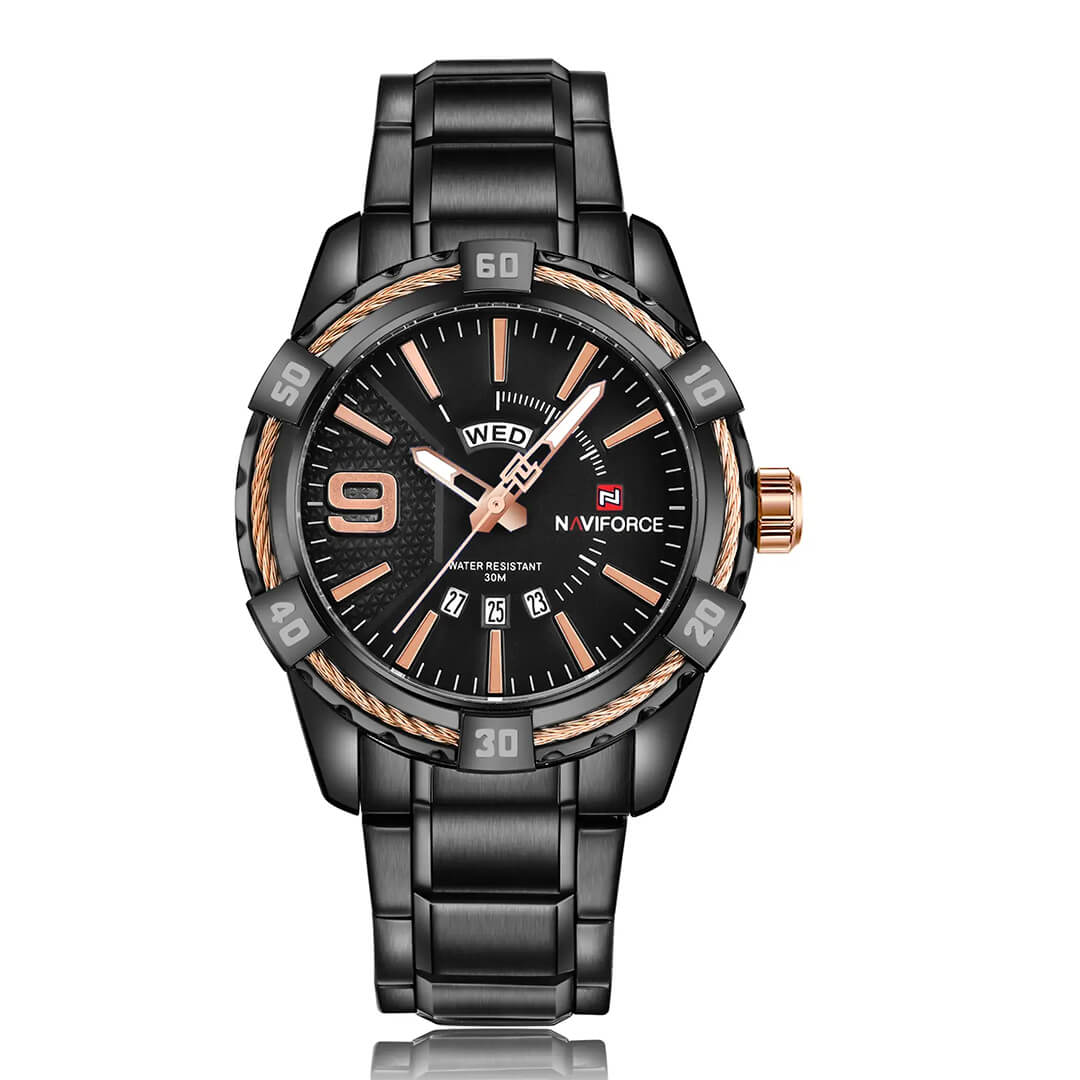 Reloj Naviforce negro NAV-141 de moda con correa de acero inoxidable, 100% original de fábrica, garantía 1 año, el acompañante perfecto para el hombre actual.