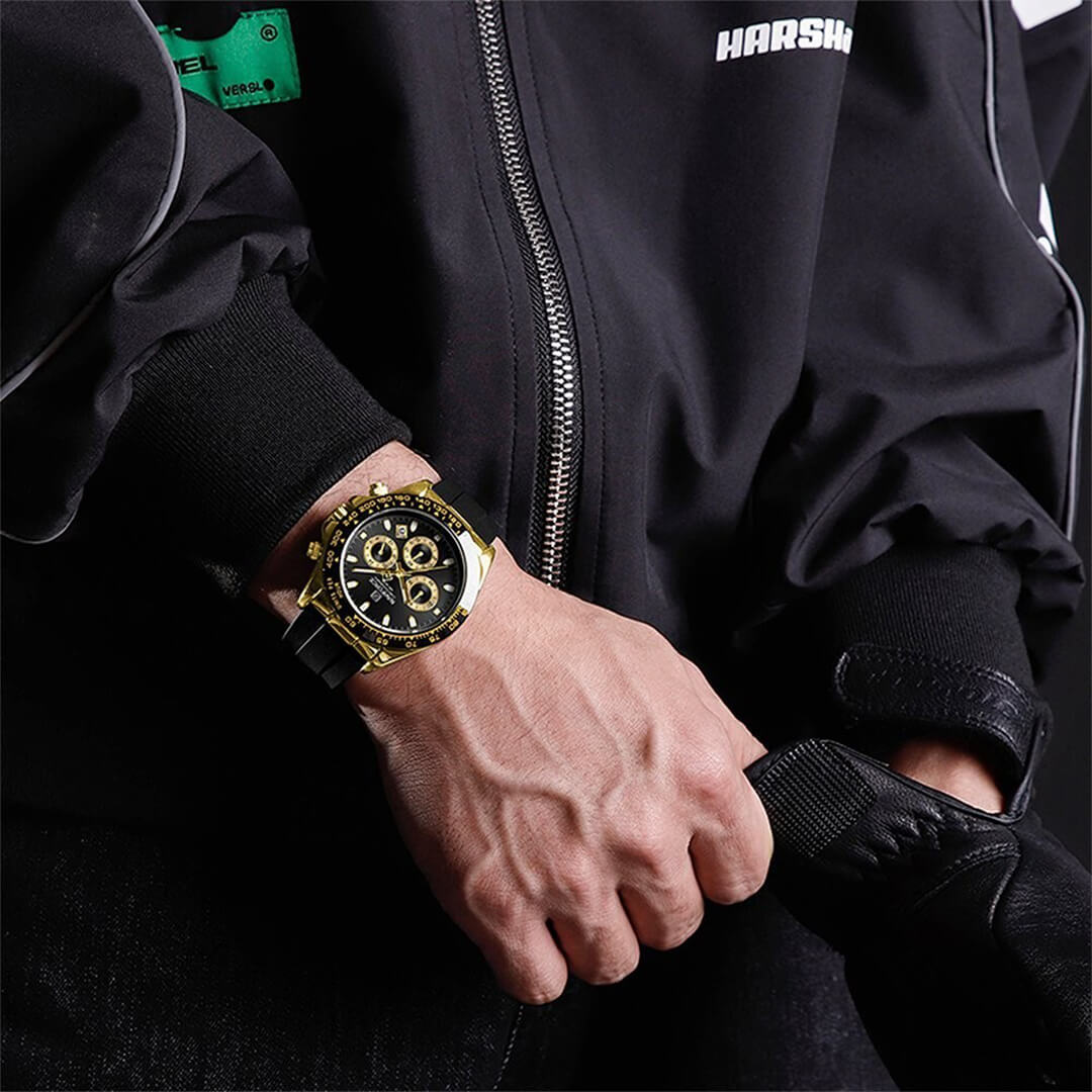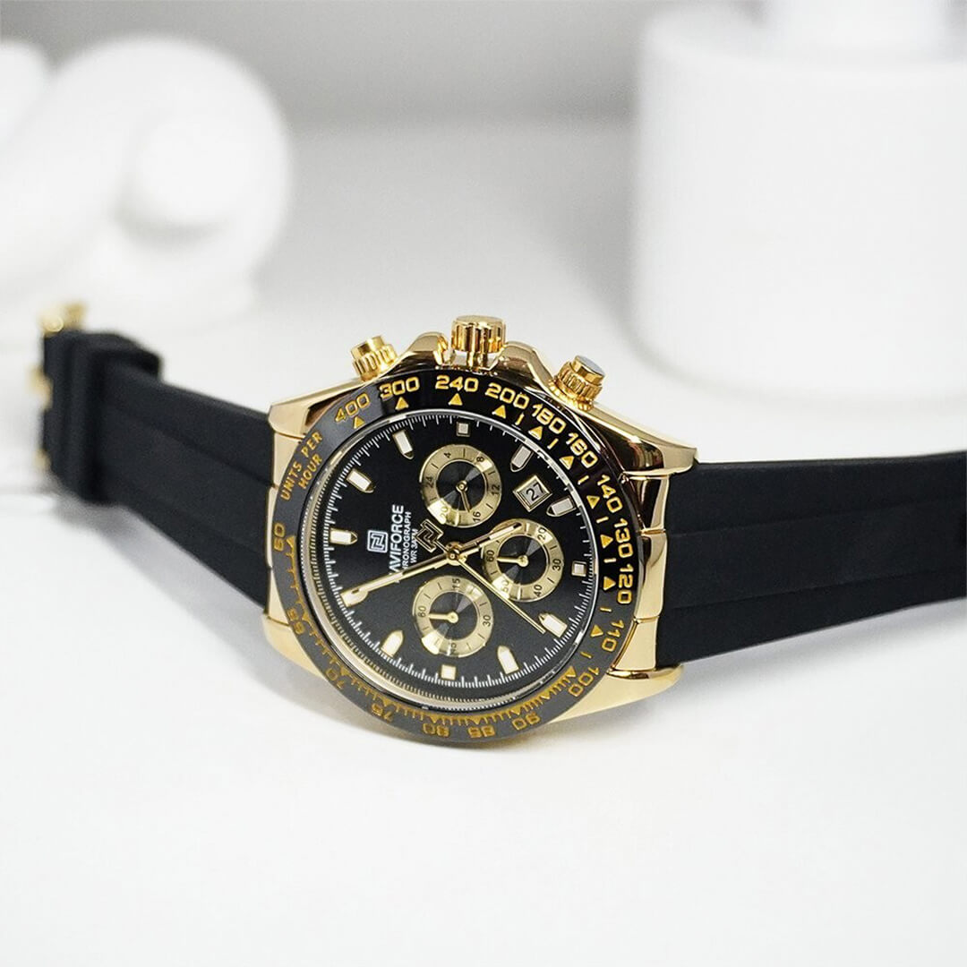 Reloj Naviforce negro con dorado NAV-136 de moda con correa de silicona, 100% original de fábrica, garantía 1 año, el acompañante perfecto para el hombre actual.