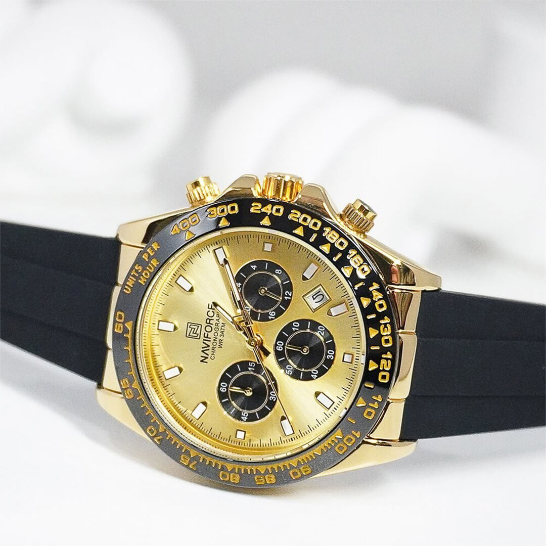 Reloj Naviforce negro con dorado NAV-137 de moda con correa de silicona, 100% original de fábrica, garantía 1 año, el acompañante perfecto para el hombre actual.