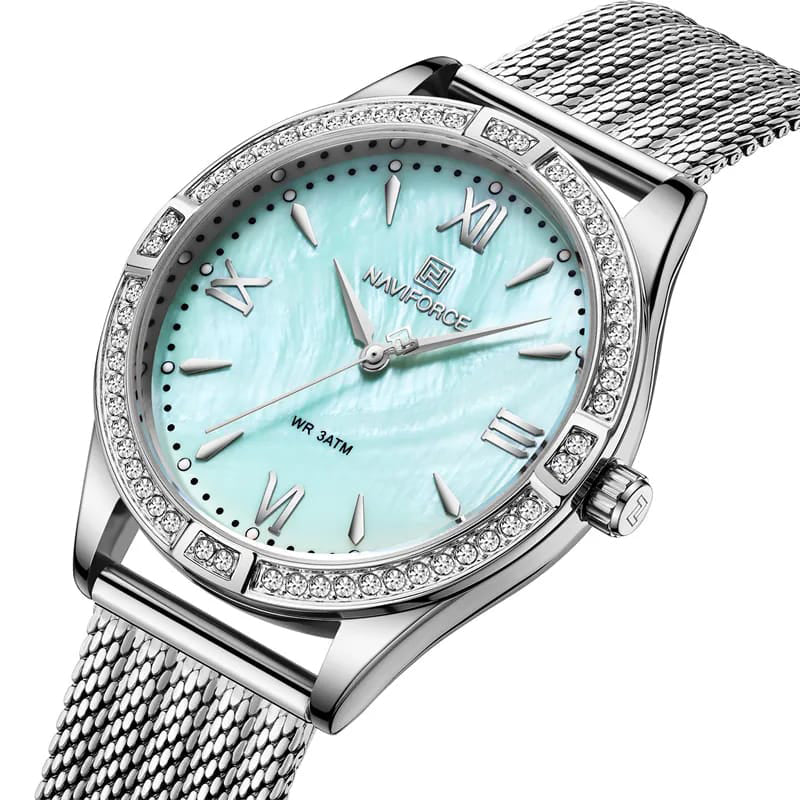 Reloj Naviforce Plateado con celeste NAV-M-8 de moda con correa de acero inoxidable, 100% original de fábrica, garantía 1 año, el acompañante perfecto para la mujer actual.