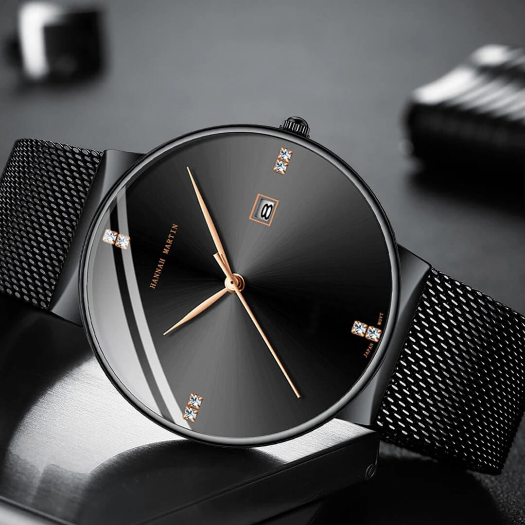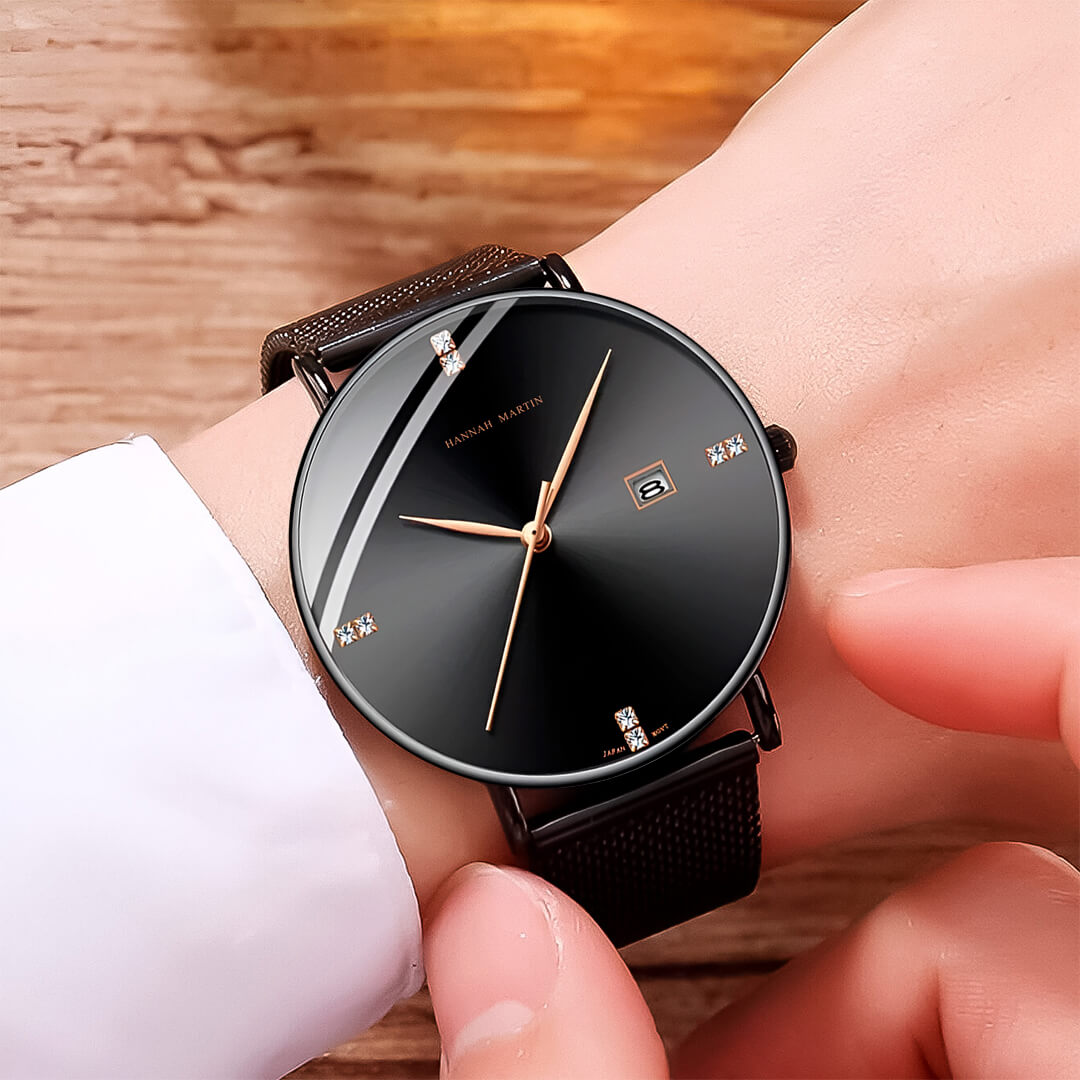El Hannah Martin (HAN-30) es un reloj diseñado para quienes buscan un estilo limpio, moderno y con acabado Premium. Su combinación negro + oro rosa transmite pureza visual, profesionalismo y una estética atemporal que se adapta a cualquier entorno: urbano, ejecutivo o casual sofisticado.