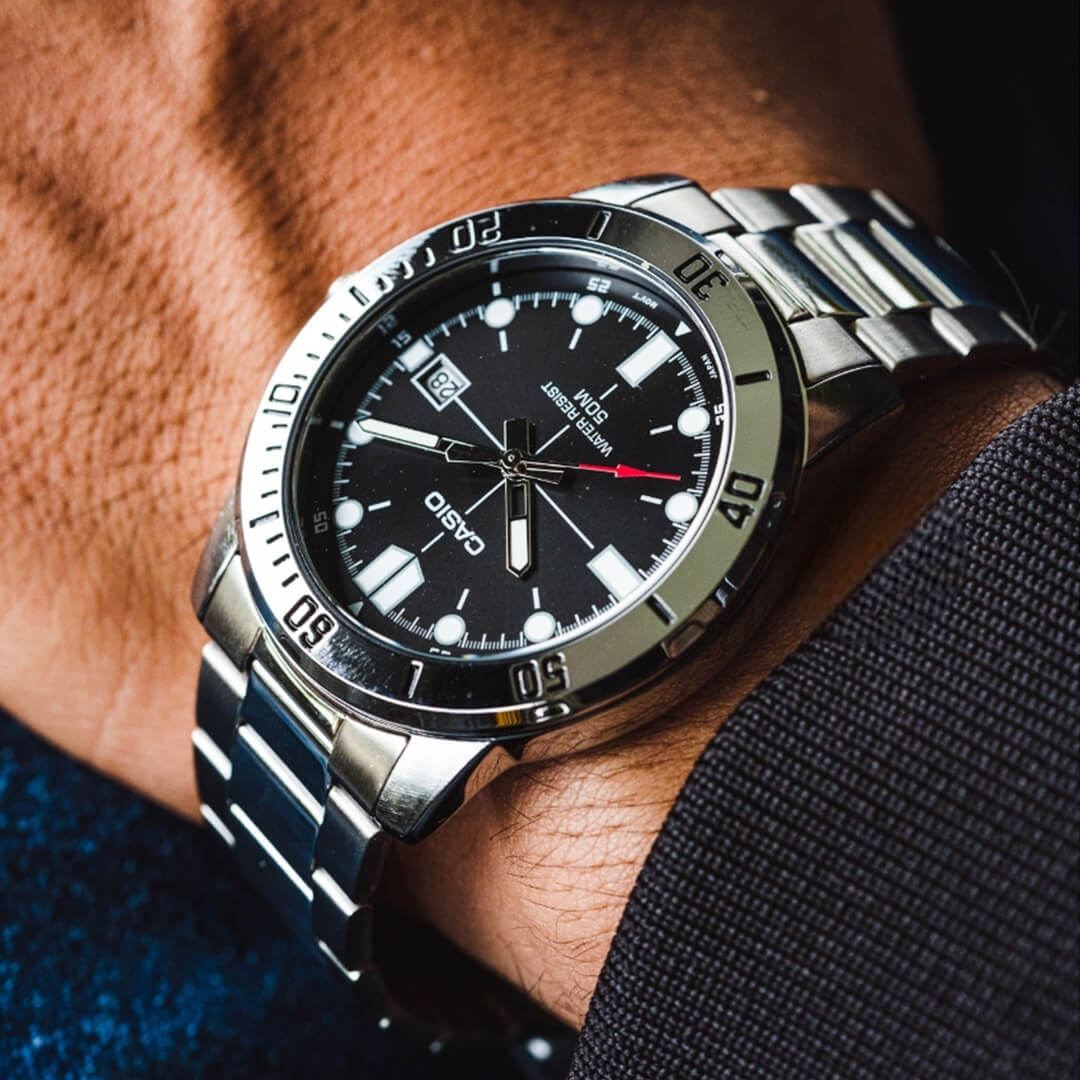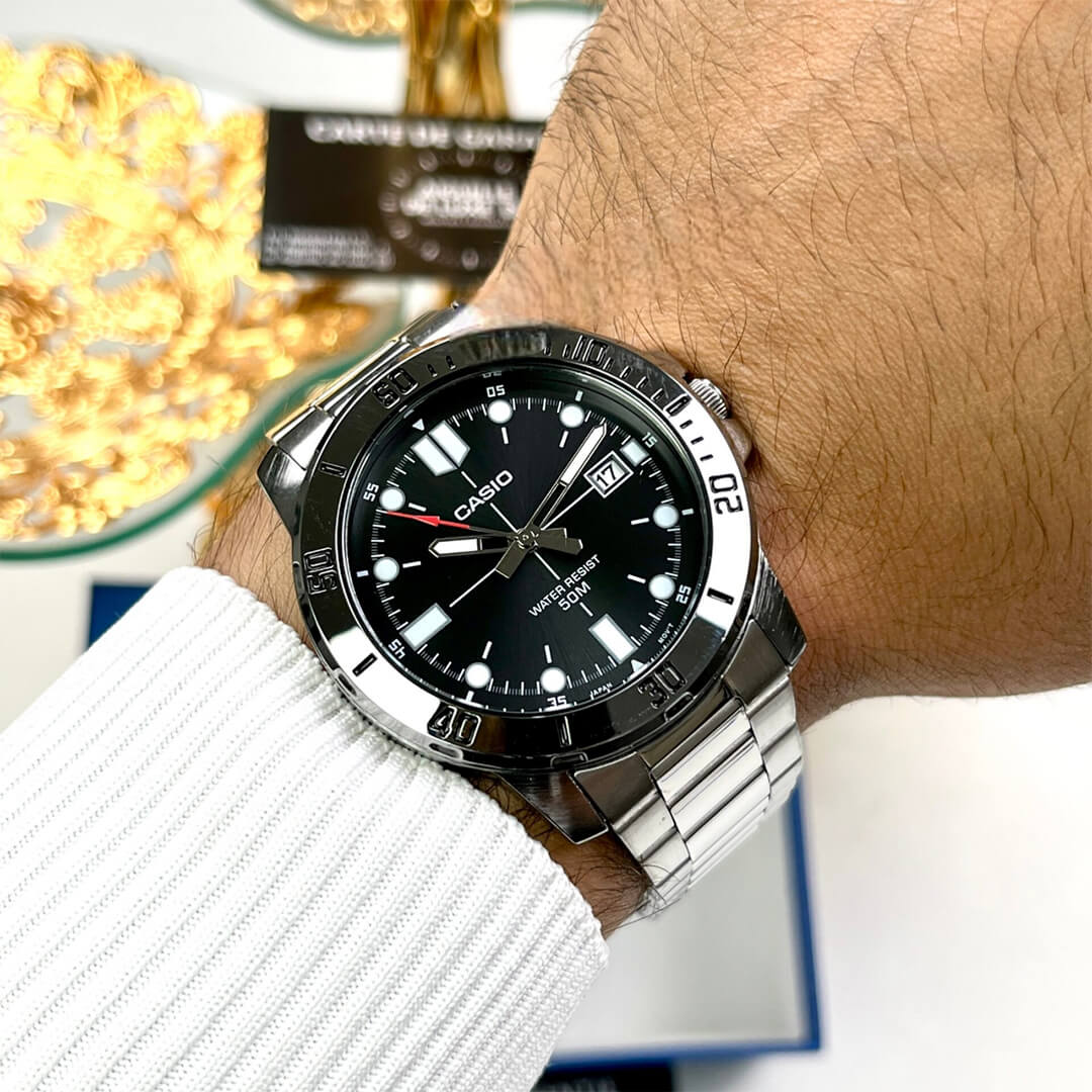 El Casio MTP-VD01D-1E (CAS-120) es un reloj masculino de diseño moderno y funcional, ideal para el uso diario gracias a su combinación de resistencia al agua de 50 metros, correa de acero inoxidable y un dial de alta visibilidad.