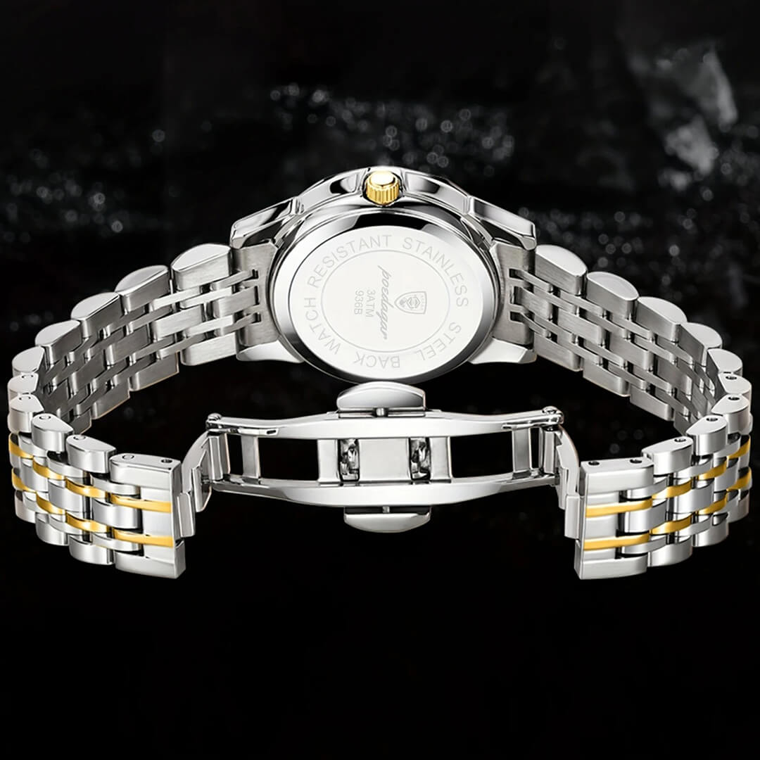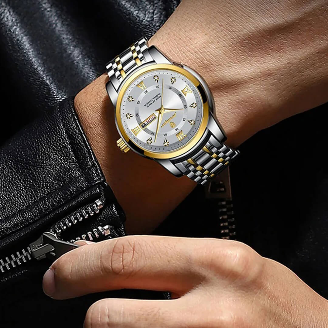 El Poedagar (POE-5) es un reloj que combina sofisticación moderna y estilo clásico. Con un diseño en acero inoxidable plateado y detalles en dorado, destaca como un accesorio elegante que transmite carácter y distinción.